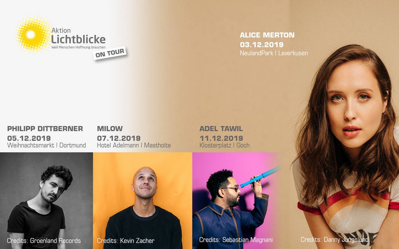 Musik-Power pur in NRW – Lichtblicke on Tour ist wieder unterwegs. Am 3.12.2019 startet das erste von vier Konzerten. Mit dabei sind in diesem Jahr die Top-Acts Alice Merton, Philipp Dittberner, Milow und Adel Tawil. Die beliebten Künstler treten für den guten Zweck auf – ohne Eintritt und Ticketverkauf.