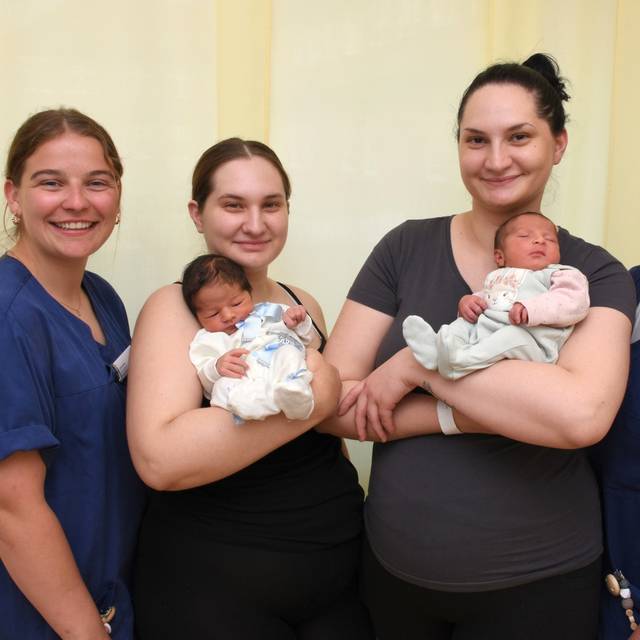 Das Foto zeigt (v.l.n.r.) Nele Verbarg, Assistenzärztin der Gynäkologie, Gesundheits- und Kinderkrankenpflegerin Lisa Deitmer und Hebamme Madita Gromke sowie Mutter Lara mit Lio Jonte.