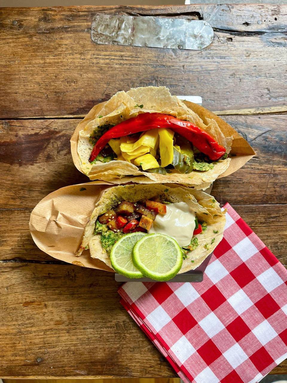 - Die Tortillas aus dem Ofen nehmen und, falls vorhanden, in einen Tacohalter stellen. Alternativ können sie auch auf einem Teller nebeneinander platziert werden. Ein gefaltetes Küchentuch oder etwas Alufolie bietet dabei zusätzlichen Halt. Jede Tortilla mit dem Tomaten-Paprika-Salat belegen und mit Tahini beträufeln. Nach Belieben in kleinen Schälchen angebratene Paprikaschoten, Pickles oder Essiggurken und Limettenscheiben dazu reichen.