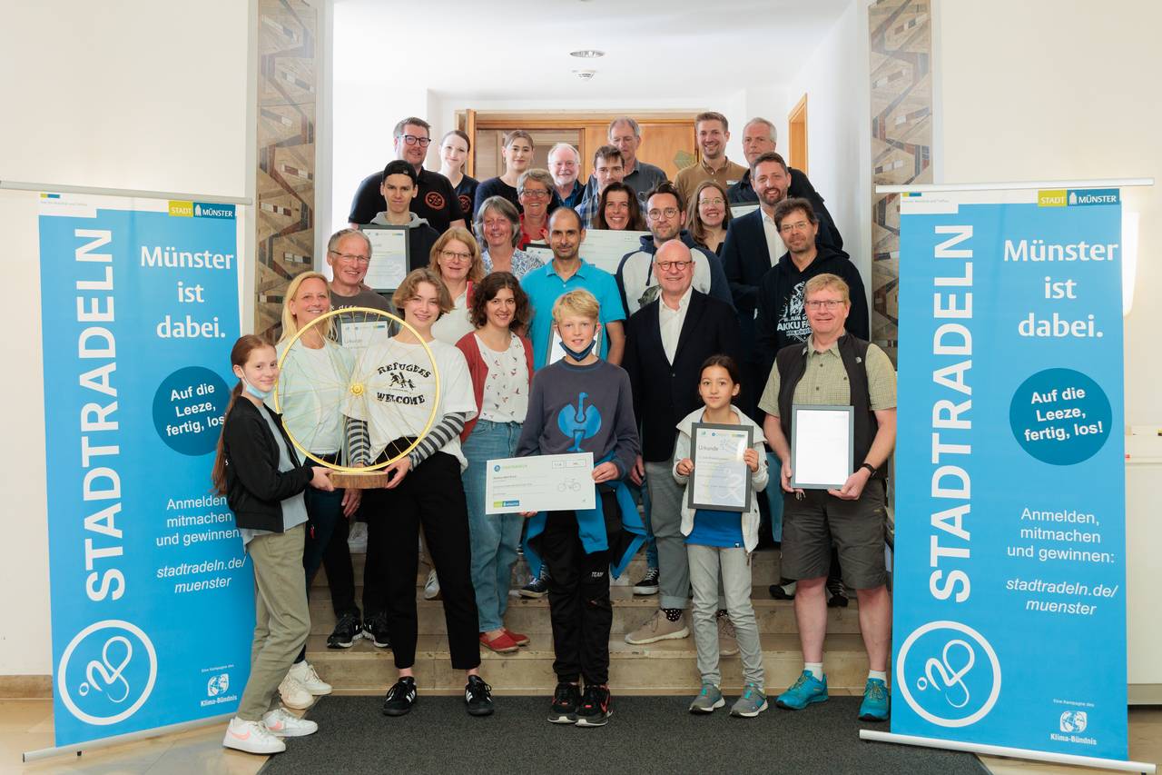 Vor gut zweieinhalb Wochen endete in Münster die Aktion "Stadtradeln". Jetzt hat Oberbürgermeister Markus Lewe besonders fleißige Radelnde aus unserer Stadt ausgezeichnet. Erneut hat die Gesamtschule Mitte die meisten Kilometer für die Aktion zusammen bekommen und damit zum dritten Mal den Wanderpokal "Das goldene Rad" erhalten. Die über 400 im Team mitradelnden Schüler:innen, Eltern und Lehrkräfte sammelten 82.409 Radkilometer