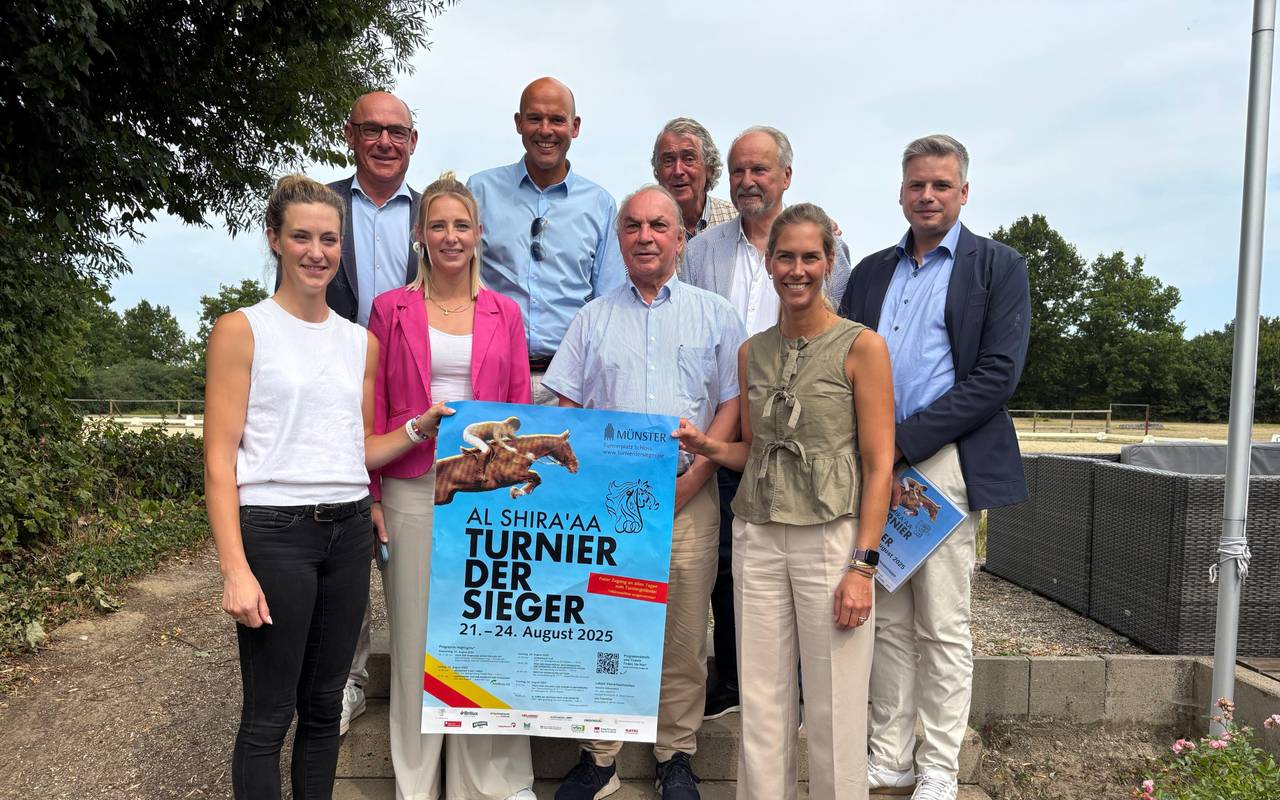 Reitsport-Fans freuen sich schon das ganze Jahr drauf: Das "Turnier der Sieger" steigt wieder. Von Donnerstag (21.08.) bis Sonntag (24.08.) könnt ihr auf dem Schlossplatz die Elite des Reitsports erleben, sowohl internationale Spitzenreiter:innen des Spring- als auch des Dressursports. Die Turnierleitung übernimmt der deutsche Springreiter Hendrik Snoek (in der Mitte vorne). Zum ersten Mal heißt die Veranstaltung "Al Shira'aa Turnier der Sieger". Der Westfälische Reiterverein von 1835 veranstaltet das Reitsportevent. Circa 3.000 Menschen können auf den Tribünen vor dem Schloss Platz nehmen. Außerdem gibt es circa 860 Plätze in der Stehtribüne. Insgesamt kommen circa 28.000 Menschen zum "Al Shira'aa Turnier der Sieger".