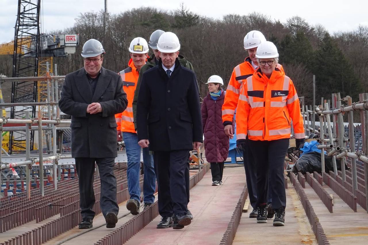 Wissing war ins Sauerland gekommen, um sich ein Bild vom Baustellenfortschritt zu machen: Seit mehreren Monaten wird der stählerne Überbau von beiden Seiten des Tales Stück für Stück über die Pfeiler geschoben. Nun sind beide Teile nur noch wenige Meter voneinander entfernt und sollen zeitnah miteinander verbunden werden, wie es am Dienstag von der Autobahn GmbH hieß. Der Brückenbauer spricht in so einem Fall von der "Stahlhochzeit".