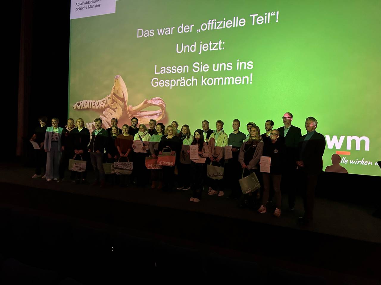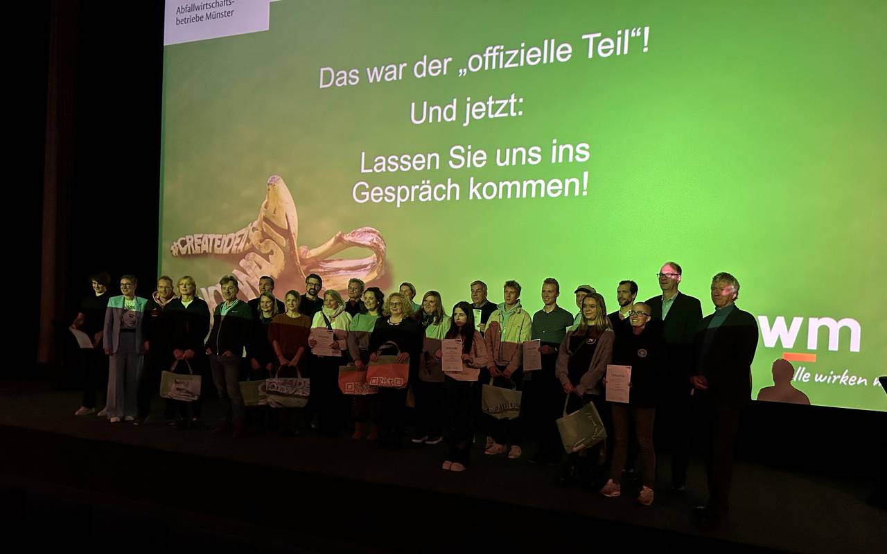 7.500 Menschen hatten ihre Stimme bei einem Online-Voting abgegeben, dazu zählten dann noch die Bewertungen einer Jury. Bei der Preisverleihung am Samstag (25.11.) im Cineplex wurden nun jeweils zwei Gewinner in den vier Kategorien "Abfallvermeidung", "Sauberkeit in der Stadt", "Mülltrennung" und "Upcycling" – also Altes zu Neuem machen, ausgezeichnet. Gleich zwei Preise sicherten sich die Schülerinnen und Schüler vom Kant-Gymnasium in Hiltrup. Die gute Nachricht für alle Siegerinnen und Sieger bei der Preisverleihung: Alle Projekte sollen mit Unterstützung der awm auch tatsächlich umgesetzt werden.