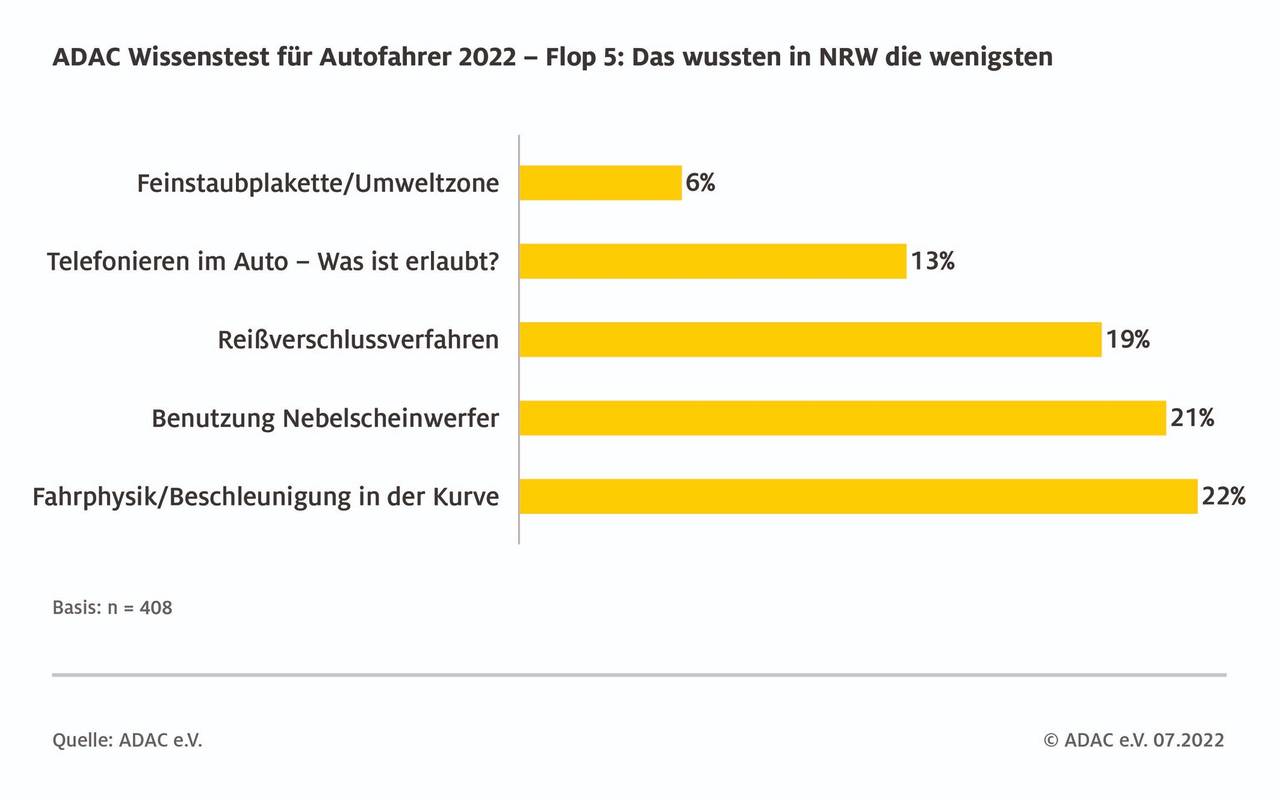 Für den "Wissenstest Autofahrer 2022" hat der ADAC insgesamt 3547 repräsentativ ausgewählte Menschen ab 17 Jahren befragt (408 aus NRW), die im Besitz eines Führerscheins sind. Die Umfrage wurde vom 17. März bis zum 1. April 2022 online durchgeführt. Befragt wurden Menschen aus ganz Deutschland (200 oder mehr aus jedem Bundesland), die mindestens drei Tage im Jahr mit dem Auto fahren. Damit wurden auch Menschen befragt, die selten am Steuer sitzen, denen die Verkehrsregeln aber ebenso präsent sein müssen wie Vielfahrern.