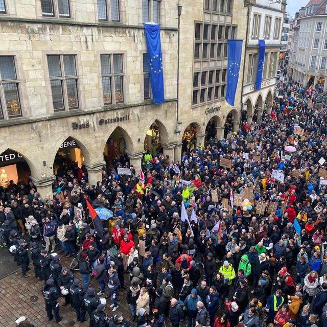 Zehntausende Menschen gingen in Münster in den vergangenen Jahren auf die Straße, um gegen den AfD-Neujahrsempfang zu demonstrieren. Das Bündnis "Keinen Meter den Nazis" organisierte die Gegendemonstrationen. Mehr als 30.000 Menschen haben dieses Jahr gegen den AfD-Neujahrsempfang protestiert. Es war die größte Demonstration der jüngeren Stadtgeschichte in Münster. Hier kommt ihr zu unserem Bericht.