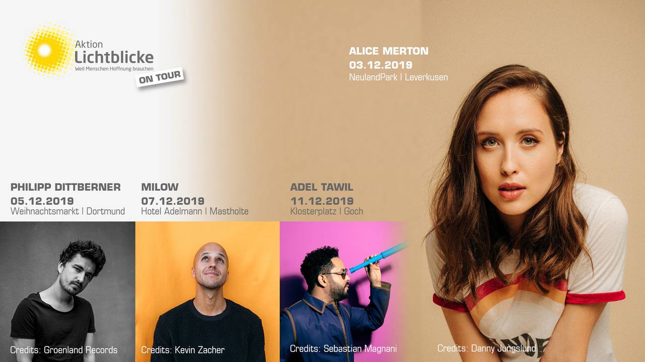 Musik-Power pur in NRW – Lichtblicke on Tour ist wieder unterwegs. Am 3.12.2019 startet das erste von vier Konzerten. Mit dabei sind in diesem Jahr die Top-Acts Alice Merton, Philipp Dittberner, Milow und Adel Tawil. Die beliebten Künstler treten für den guten Zweck auf – ohne Eintritt und Ticketverkauf.