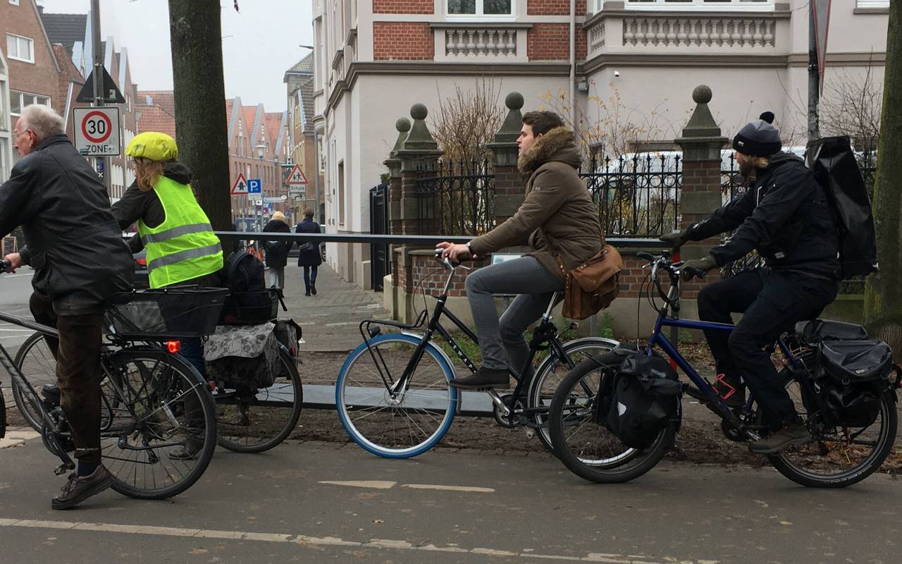 In Münster gibt es jetzt sechs so genannte Ampeltrittbretter. Radfahrende können an Ampeln warten, ohne vom Rad absteigen zu müssen.