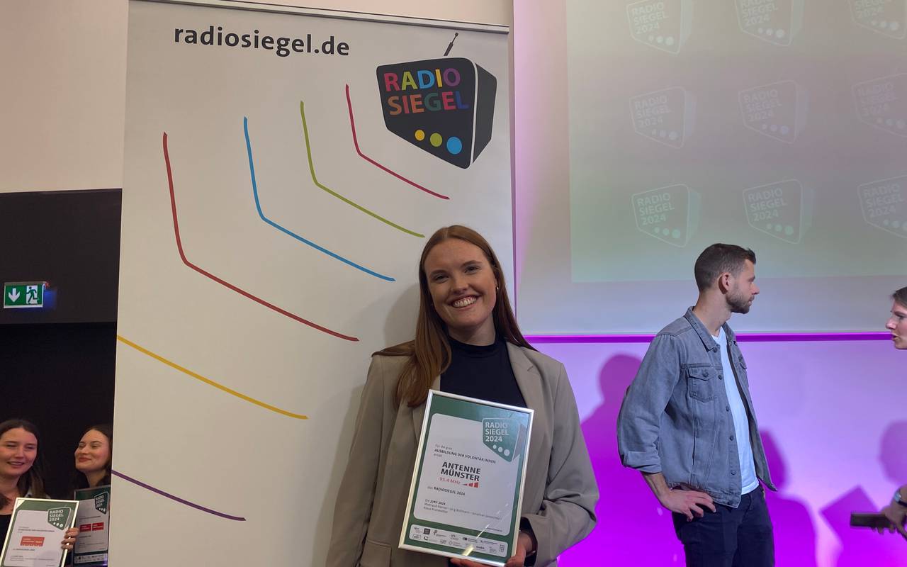 ANTENNE MÜNSTER-Volontärin und Moderatorin Malena Stöhler nahm die Auszeichnung entgegen. Ausgezeichnet wurde ANTENNE MÜNSTER beim Radio-Netzwerk-Tag in Frankfurt für die hohe Qualität der Volontärs-Ausbildung. Darüber entschieden hat eine Fachjury mit renommierten Radio-Profis. Das RADIOSIEGEL ist eine gemeinsame Initiative mehrerer Landesmedienanstalten, der Grimme Akademie und weiterer Verbände und Institutionen der Medienbranche.