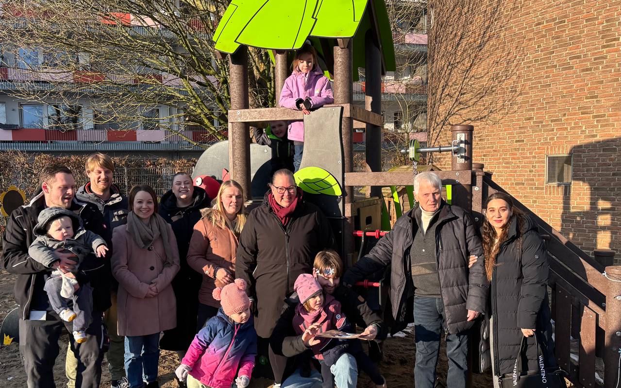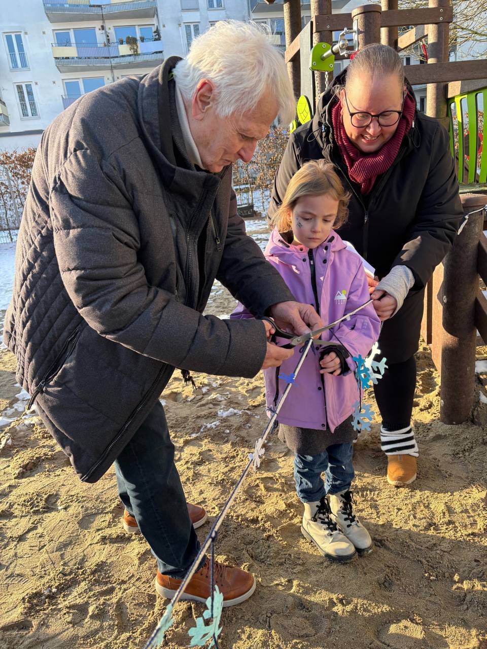Ein Großteil der Spendensumme floss in den Bau einer neuen Rutsche für die Kinder, die jetzt offiziell mit einem Fest eingeweiht wurde. Horst Eschler und seine Begleitung Aysun Karimanova waren dazu eingeladen und durften gemeinsam mit den Kindern und Kita-Leiterin Katja Böckenholt das Band vor der Rutsche durchschneiden.