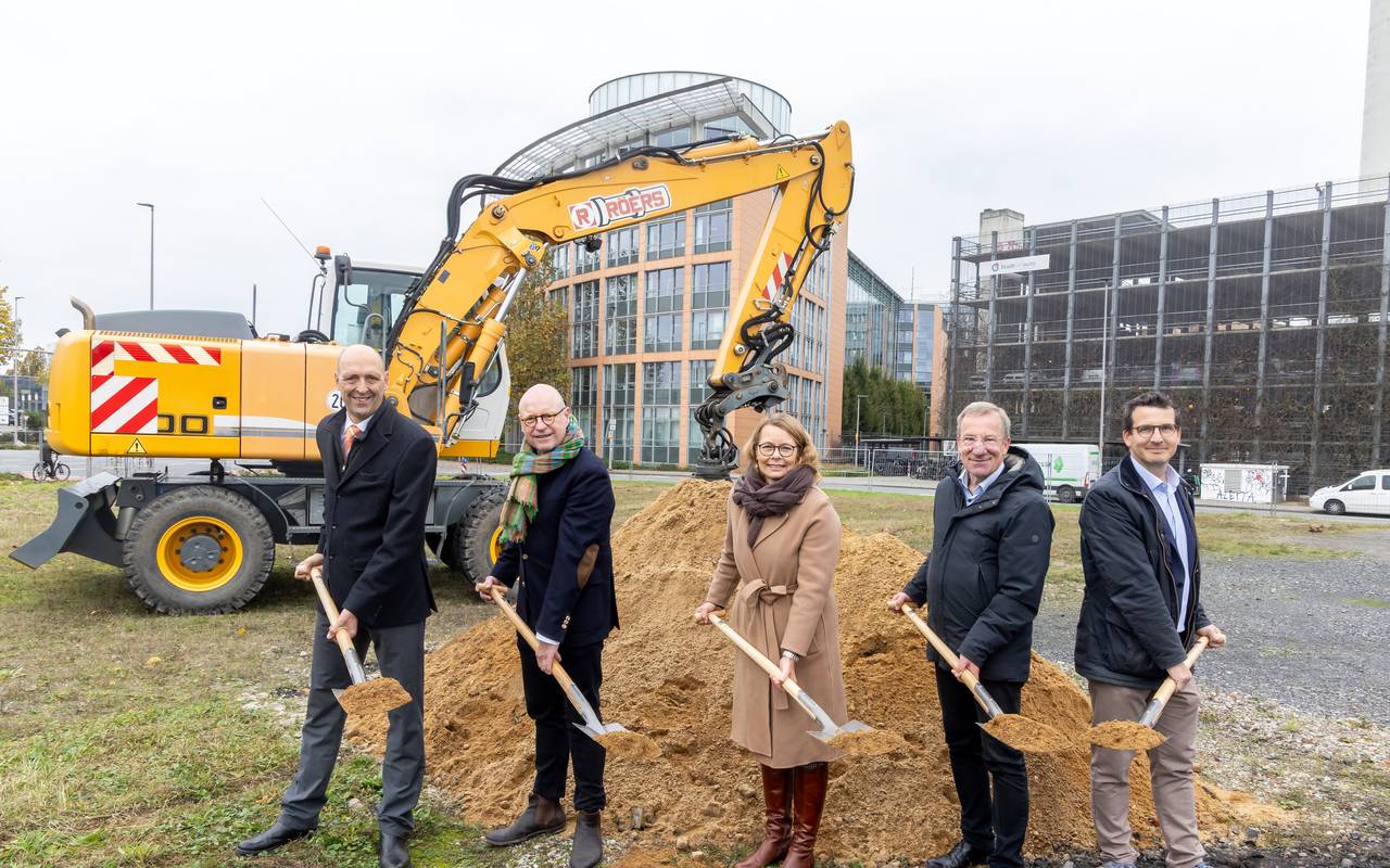 Der erste Spatenstich ist getan, nun beginnen die Spezialtiefbauarbeiten für das neue Stadthaus 4. (Foto v.l.) Harald Gollwitzer (Geschäftsführer der gleichnamigen Spezialtiefbau-Firma), Oberbürgermeister Markus Lewe, Andrea Piehl (Geschäftsführerin der Bauwerke Münster GmbH), Stadtrat Wolfgang Heuer und Jörg Berens (Aufsichtsratsvorsitzender der Bauwerke Münster GmbH) für den symbolischen ersten Spatenstich am künftigen Stadthaus 4 vor rund 60 geladenen Gästen gemeinsam zum Spaten.Oberbürgermeister Lewe bezeichnet den Spatenstich als wichtigen Meilenstein für die Stadt Münster und ihre Verwaltung: