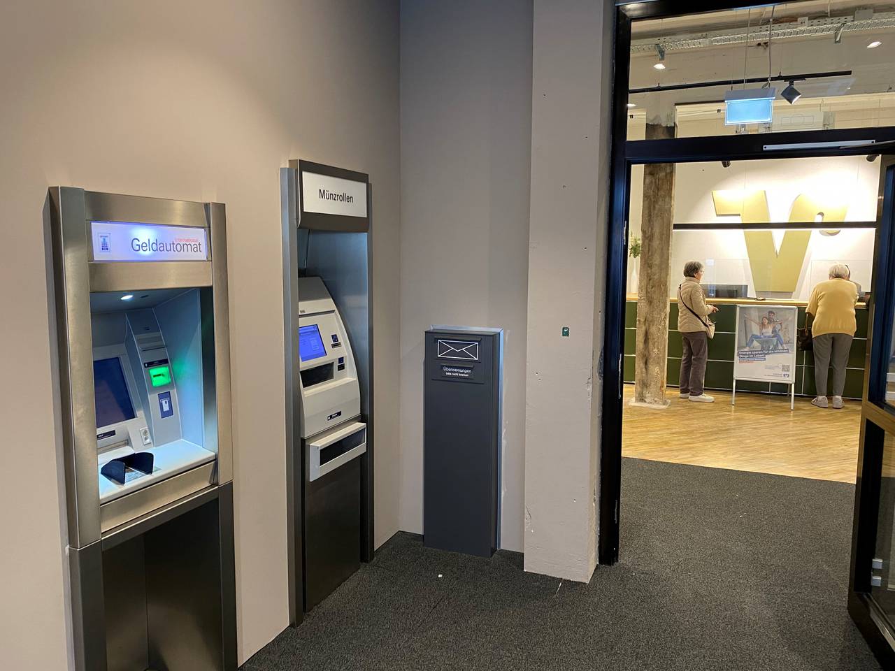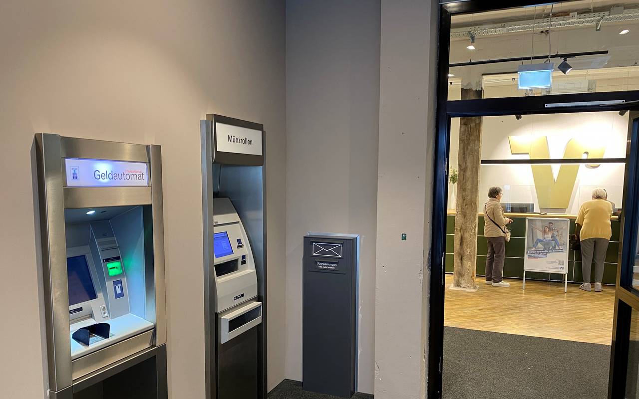 Drei Geldautomaten gibt es im Eingangsbereich. Nur die alte Kasse, die finden die Kunden und Kundinnen jetzt erstmal in der Volksbank-Filiale an der Hammer Straße.