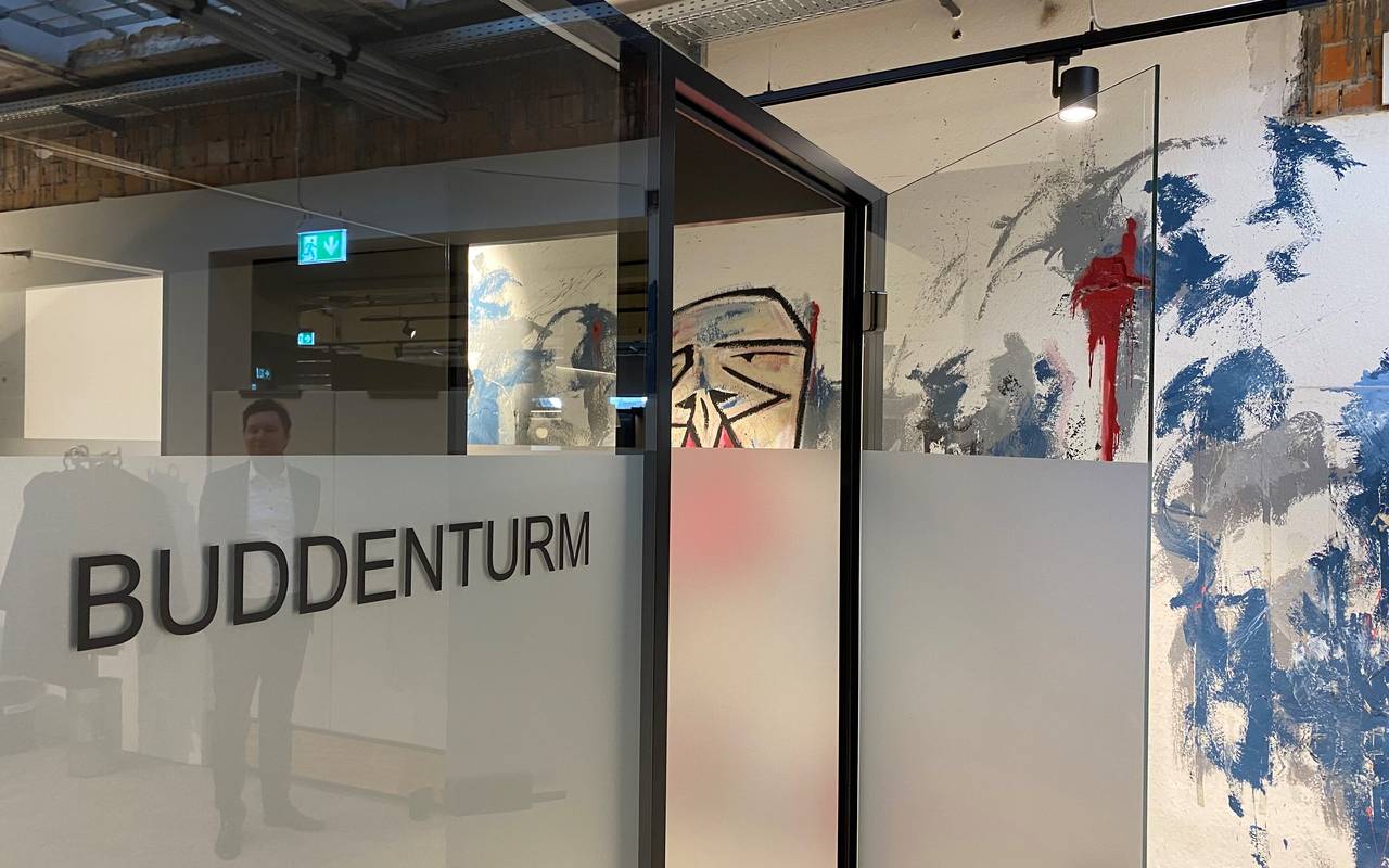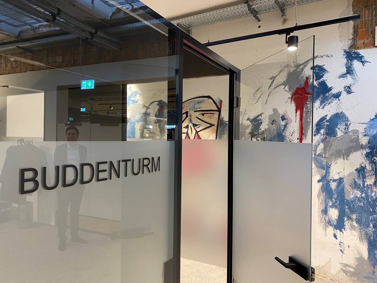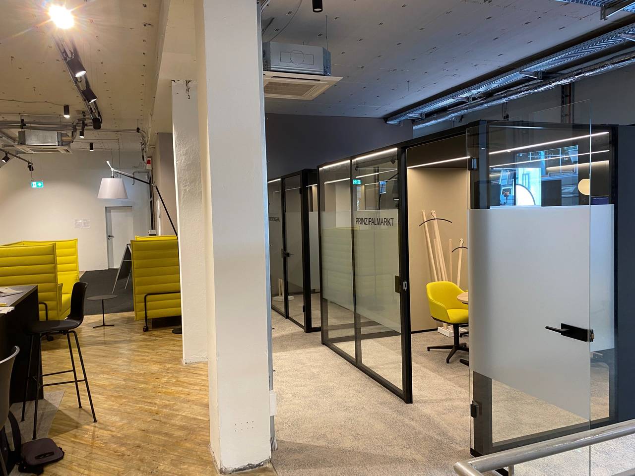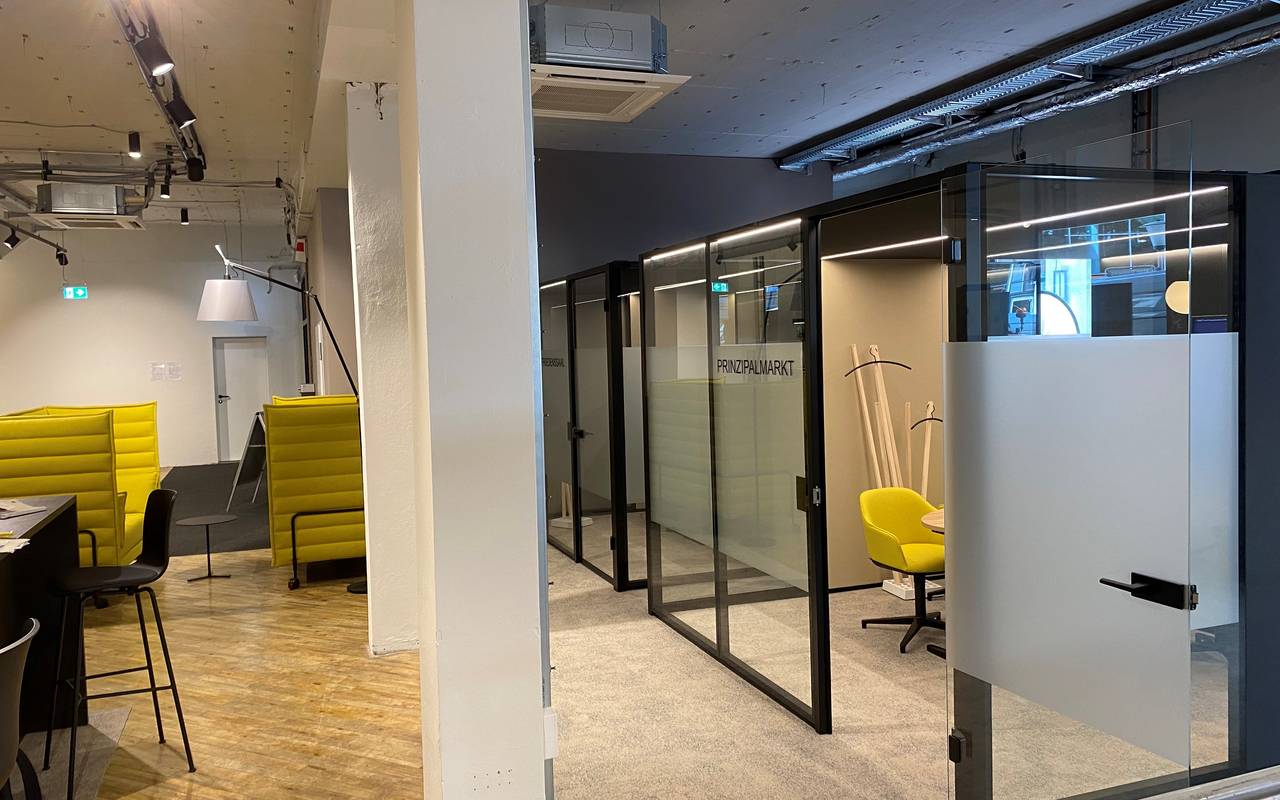 Gläserne Würfel mit Namen wie "Prinzipalmarkt", "Friedenssaal" oder "Buddenturm" bieten Platz für ruhige Beratungsgespräche.