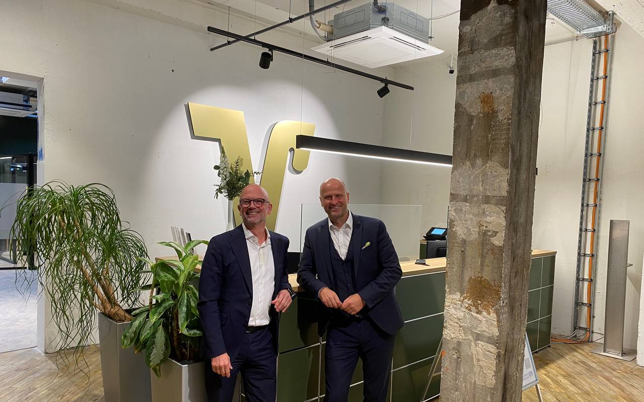 Bewusst hat die Volksbank den Baustellencharme mit Graffitti an unverputzen Wänden erhalten.