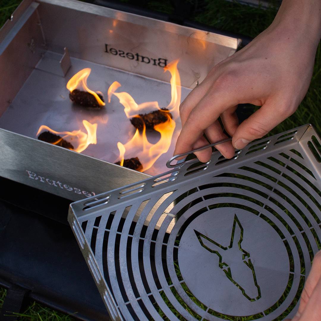 Der "Bratesel" ist besonders auf Nachhaltigkeit und Praktikabilität hin aus ausgelegt. Die Grill-Satteltasche macht es möglich, alles, was es zum Grillen braucht, bequem zu transportieren. Vor Ort kann die äußere Hülle abgenommen und unter den Grill als Schutzfolie für die Wiese gelegt werden, damit diese nicht verbrennt. Der Bratesel wird ausschließlich in Münster und Umgebung hergestellt und hat den Anspruch, professionell grillen zu können. Die Erfindung kann in unterschiedlicher Ausführung, mit normalem Edelstahl-Grillrost oder mit Premium "Grill Grates", erstanden werden. Hier gibt es weitere Infos zum "Bratesel".