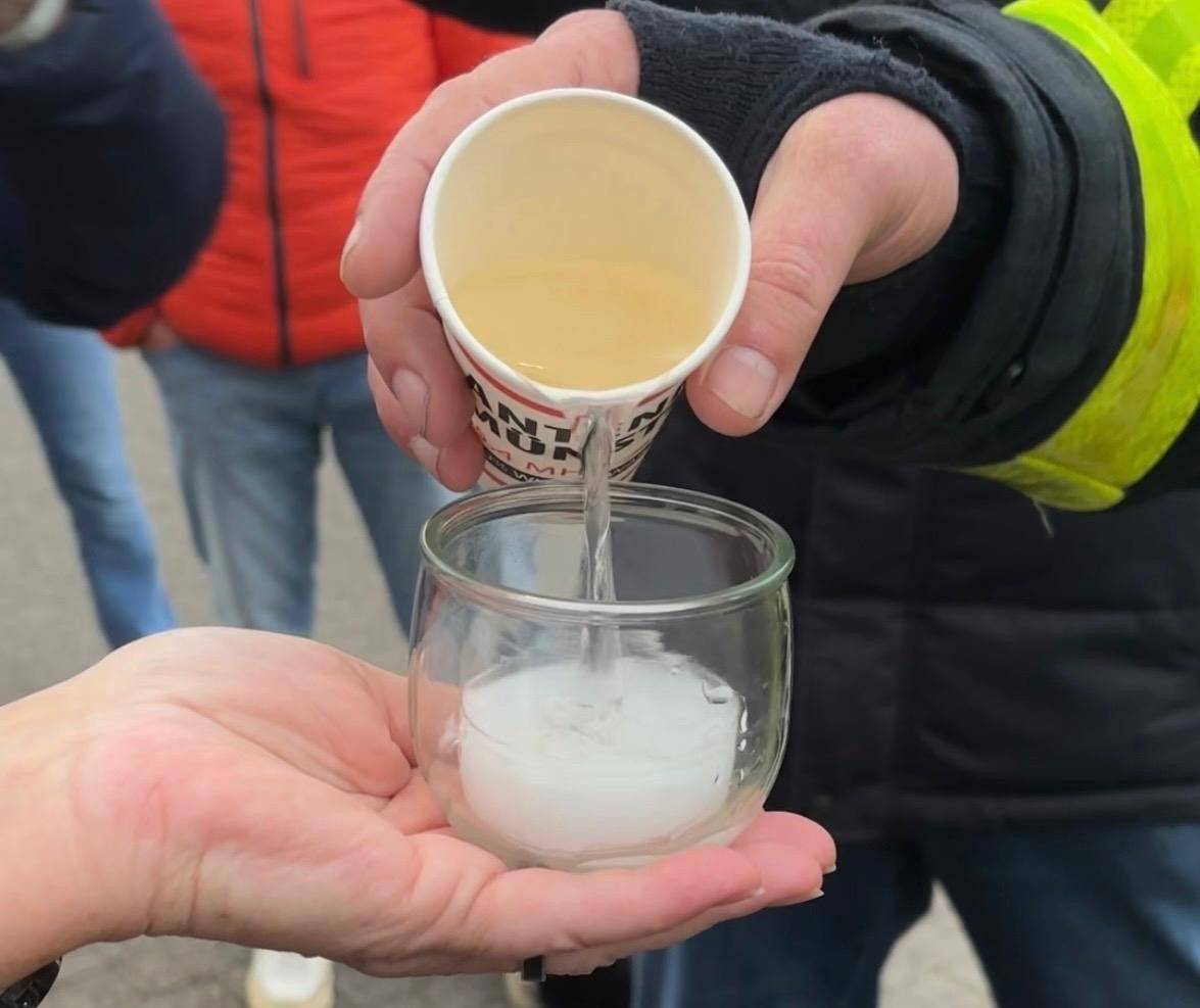 Mit einem Schluck Wasser aus einem ANTENNE MÜNSTER-Becher hat die Freiwillige Feuerwehr Münster-Altstadt die erste Aufgabe für "Cash für den Club" erfüllt und sich 1.000 Euro gesichert.