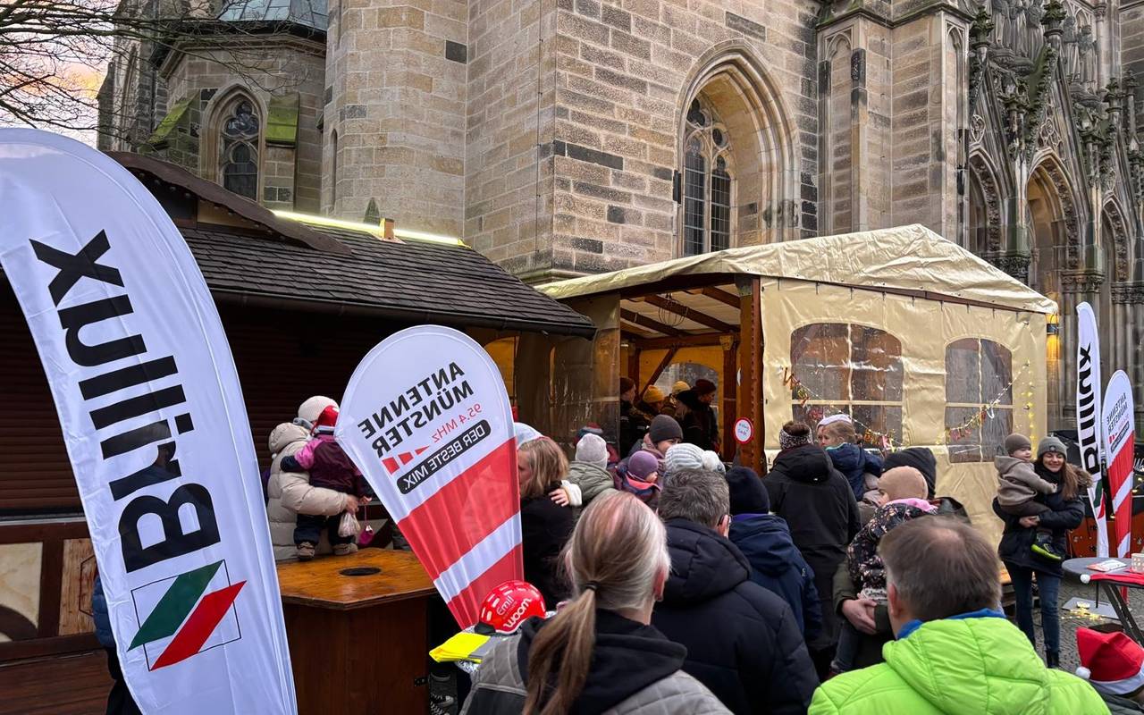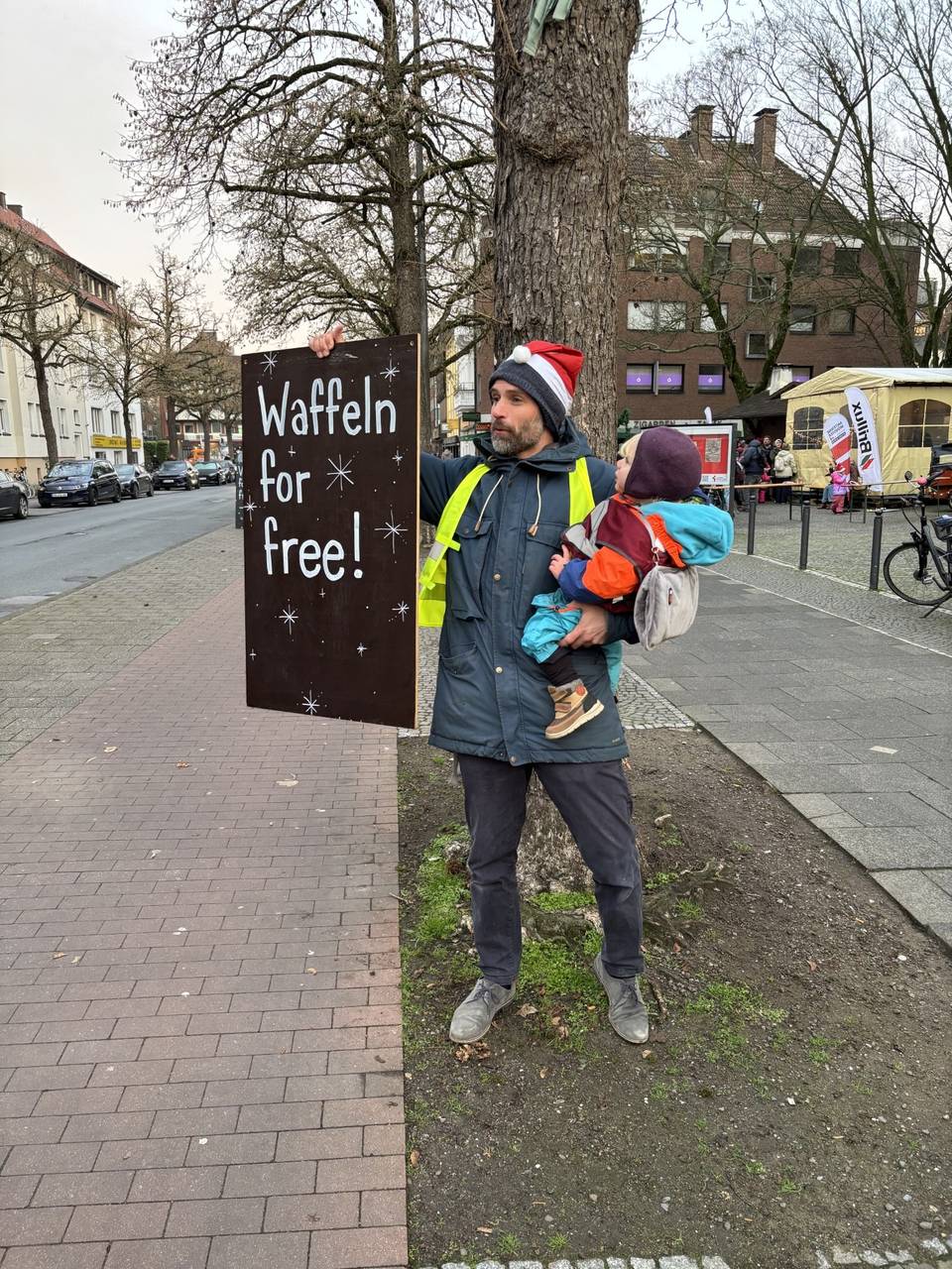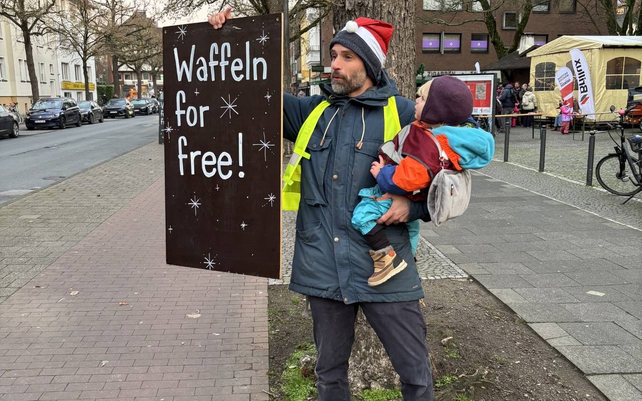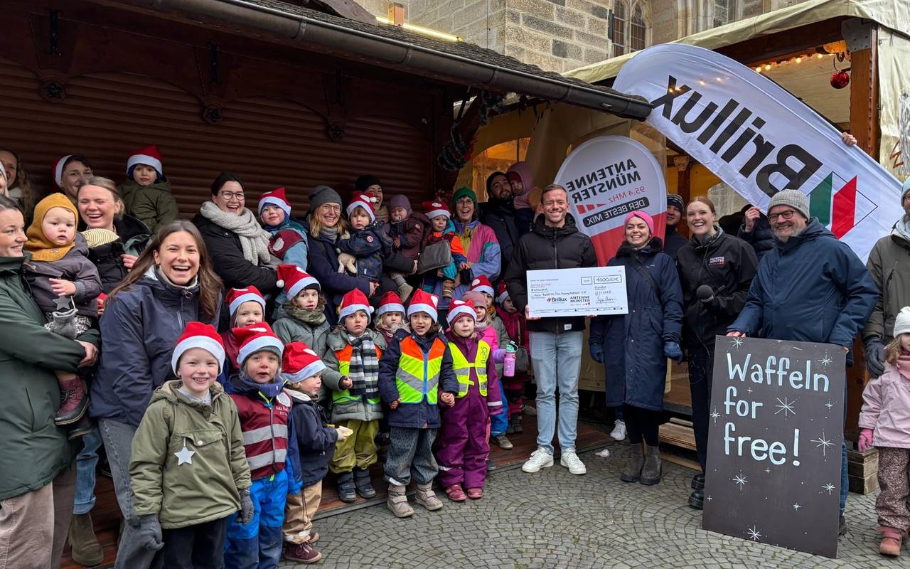 1.000 Euro hat sich die Kita Bullerbü und der dazugehörige Elternverein "Die Krümelmonster" bei unserer Aktion "Cash für den Club" gesichert. Und wie! Innerhalb von 24 Stunden haben die Kita-Kinder und -Eltern, sowie die Erzieherinnen und Erzieher der Kita ein richtiges Weihnachts-Event auf die Beine gestellt. In einer - von einer gegenüberliegenden Gastronomie zur Verfügung gestellten - Holzhütte, wurden auf sechs Waffeleisen die Waffeln gebacken. Und anschließend an Eltern und Passanten vor der St. Josephs-Kirche verteilt.