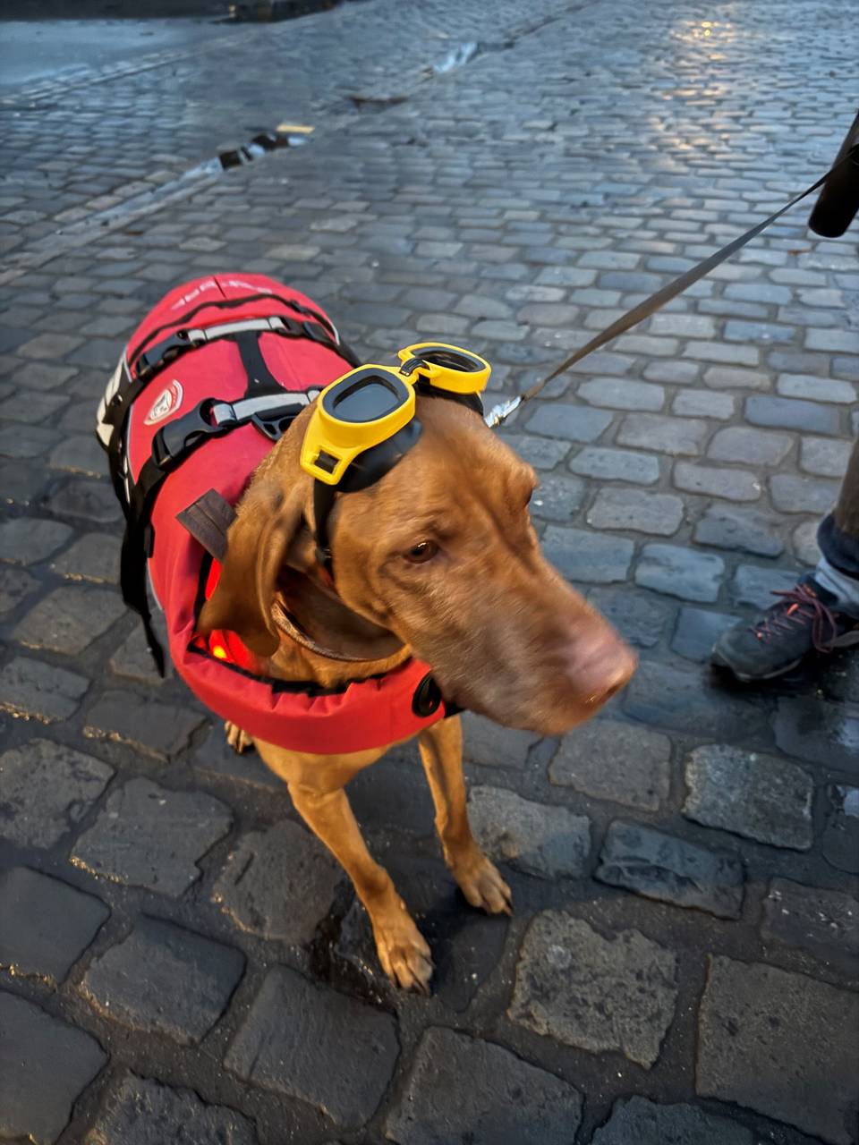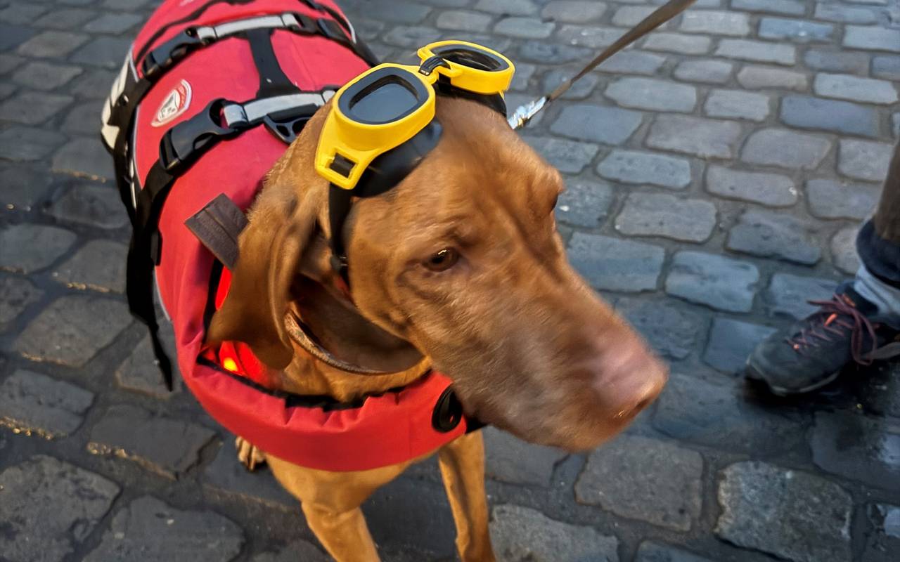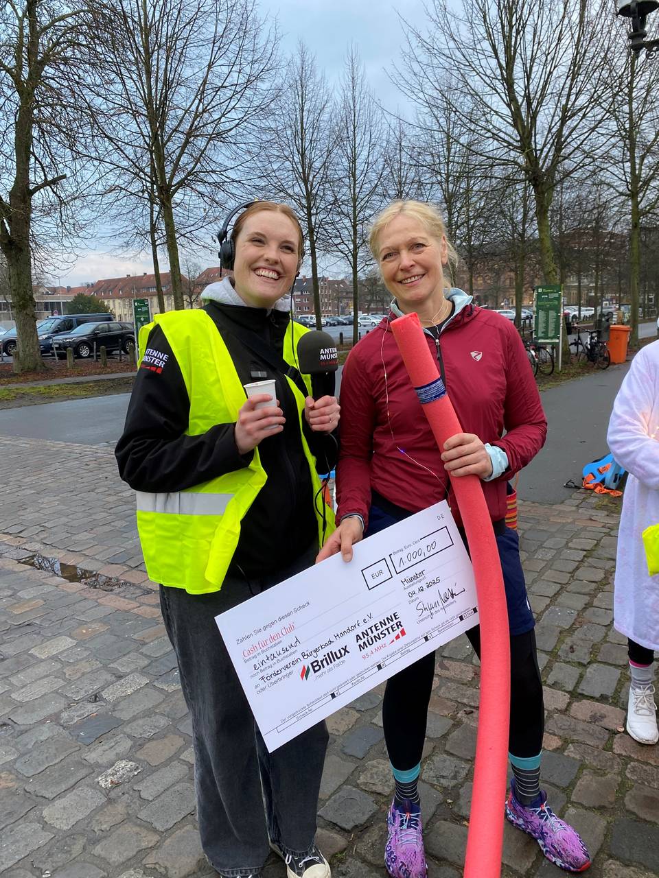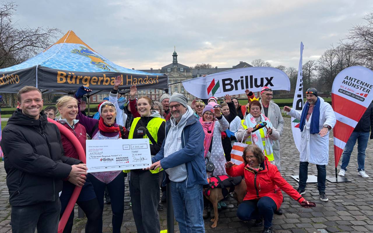 Im Bademantel, mit Schwimmflossen und Badekappe, mit Pool-Noodle oder Taucherbrille: Das Bürgerbad Handorf hat sich so richtig ins Zeug gelegt, um die Aufgabe zu erfüllen. Selbst Vierbeiner "Fietje" war mit Schimmweste und Brille ausgestattet (s. Foto unten). Nach dem "Zieleinlauf" vor dem Schloss gab's heißen Kinderpunsch für die Schwimmerinnen und Schwimmer und Vereinsvorsitzende Monika Schürmann nahm einen Scheck über 1.000 Euro entgegen. Überreicht vom Sponsor "Brillux" (Johannes Schmittmann) und ANTENNE MÜNSTER (Chefredakteur Stefan Nottmeier).