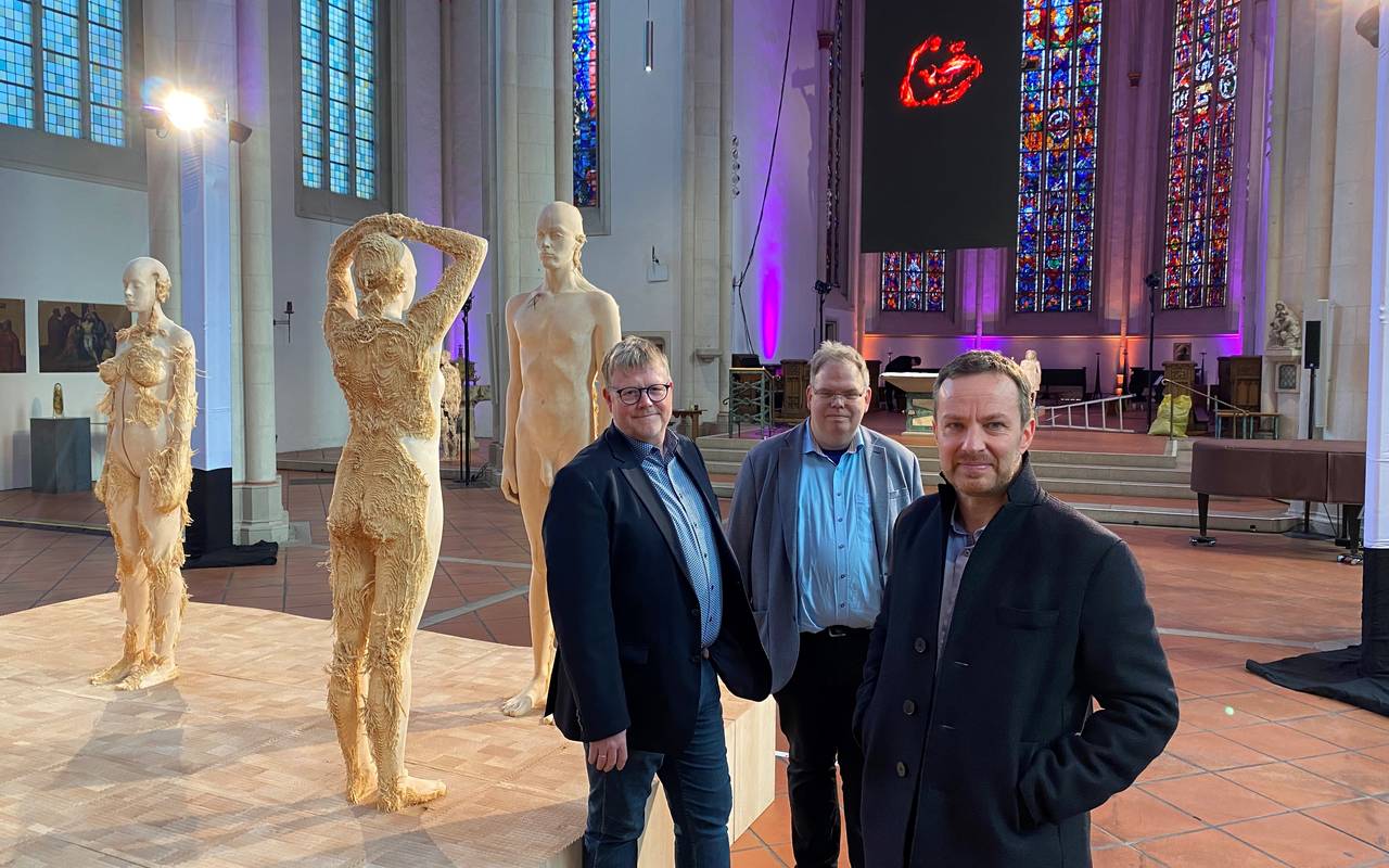 Auch in diesem Jahr findet wieder der Cityadvent in der Überwasserkirche statt. Nach dem überragenden Erfolg der letzten Jahre hat sich das Team um Rupert König (l.), Leiter des Kirchenfoyers, und Markus Kortewille (M.), ehrenamtlicher Projektkoordinator, mal wieder etwas ganz Besonderes ausgedacht: Gezeigt werden in diesem Jahr zahlreiche Skulpturen des Südtiroler Bildhauers Aron Demetz (r.). Ein international gefragter Künstler, der in seinen Werken die Zerbrechlichkeit der Menschheit thematisiert.