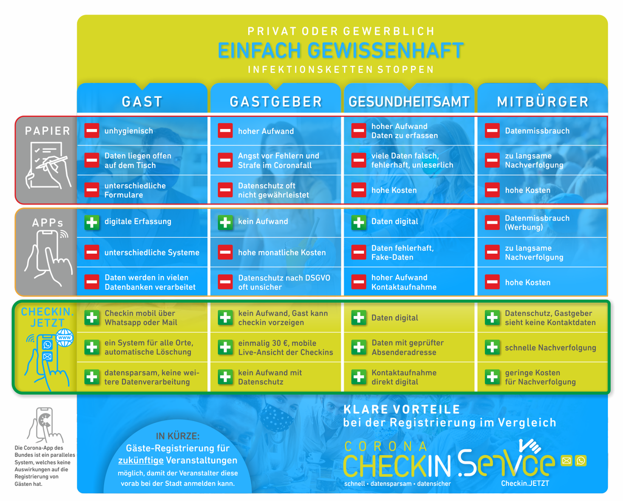 Die einen sagen: "Endlich mal ein Anlass die Handynummer auswendig zu lernen!", andere sind genervt davon bei jedem Restaurant- und Gaststättenbesuch erneut Name, Telefonnummer und E-Mailadresse in eine Liste einzutragen. Immerhin gibt es auch bei uns in Münster schon Konzepte, bei denen man seine Daten digital hinterlassen kann, wie beispielsweise den digitalen Biergarten.MS. Guido Dermann hat jetzt eine Plattform entwickelt, bei der man sich über den Browser einfach selbst einchecken kann. Die Daten werden dann coronakonform für die Gastronomie erfasst.