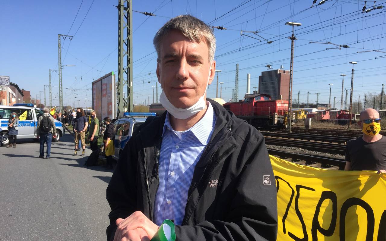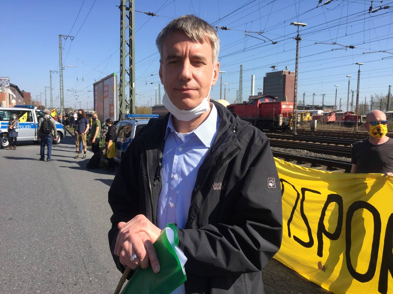 Beim Güterbahnhof am Alfred Krupp Weg / Ecke Roddestraße hatten sie sich versammelt. Denn dort kam der Zug mit radioaktivem Uran vorbei auf seinem Weg von der Urananreicherungsanlage Gronau zu einer russischen Atomfabrik.