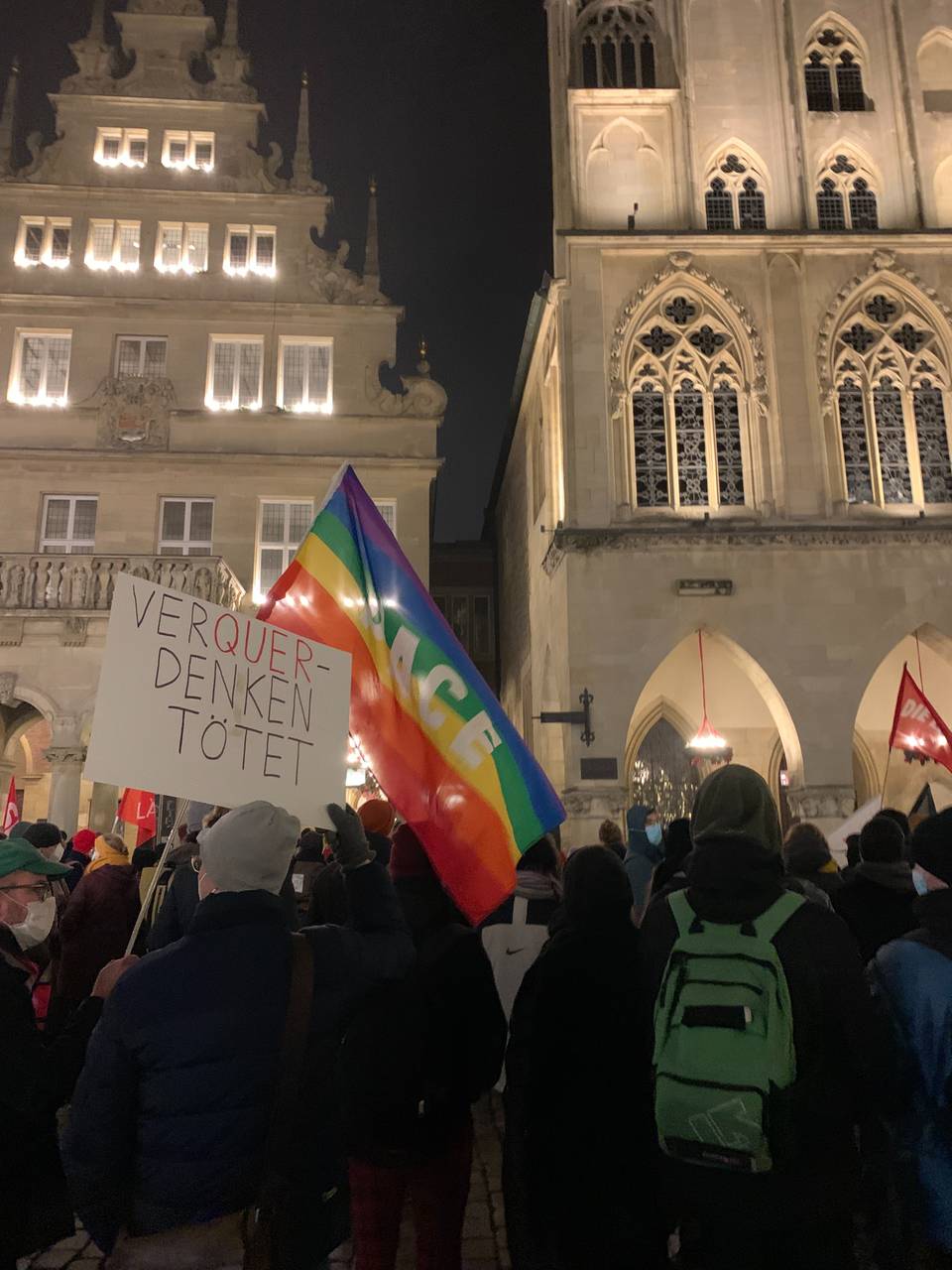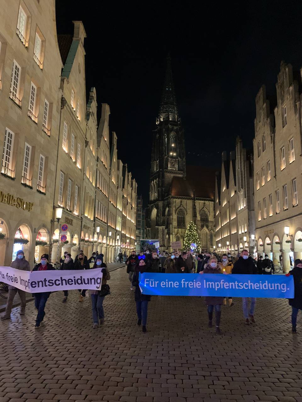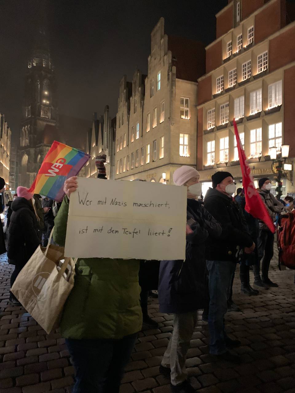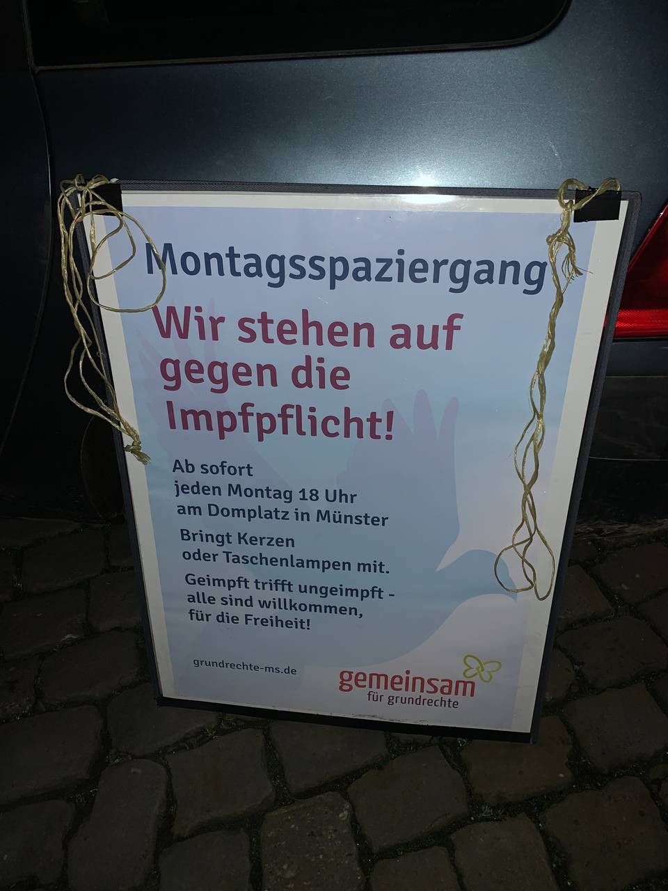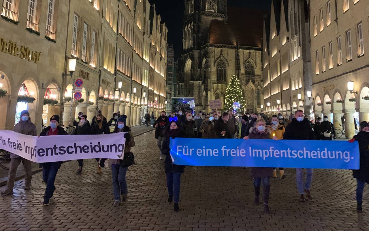 Wie schon in den vergangenen Wochen treffen sich auch an diesem Montag vor Weihnachten Impfskeptiker:innen und Corona-Leugner:innen zum sogenannten "Montagsspaziergang" in Münster. Bereits am Wochenende hatte es in mehreren deutschen Städten ähnliche Demonstrationen gegeben.