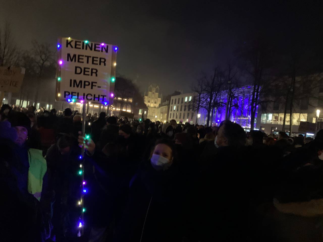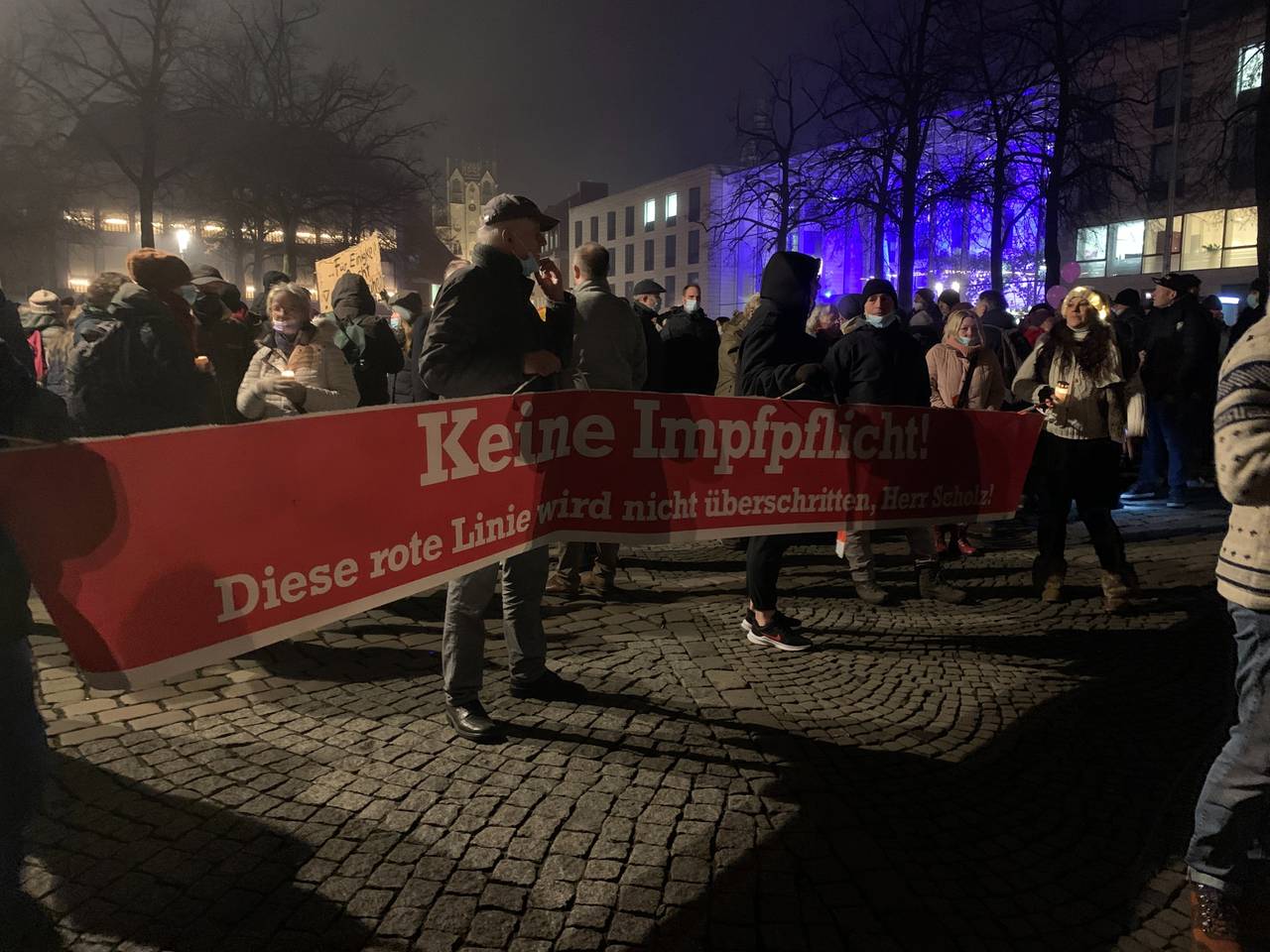 Zur erneuten Demonstration aufgerufen hatte die coronaskeptische Bewegung "Gemeinsam für Grundrechte". Treffpunkt war wie auch in den vergangenen Wochen wieder der Domplatz, auf dem gegen 18 Uhr 700 Personen zusammenkamen. Von dort aus zogen die Demonstrierenden durch die Innenstadt. Im Laufe des Abends stießen dann noch weitere hunderte Personen dazu, sodass laut Angaben der Polizei insgesamt 1.300 Demonstrierende unterwegs waren – um ihren Unmut über die Corona-Maßnahmen und die Corona-Impfung deutlich zu machen.