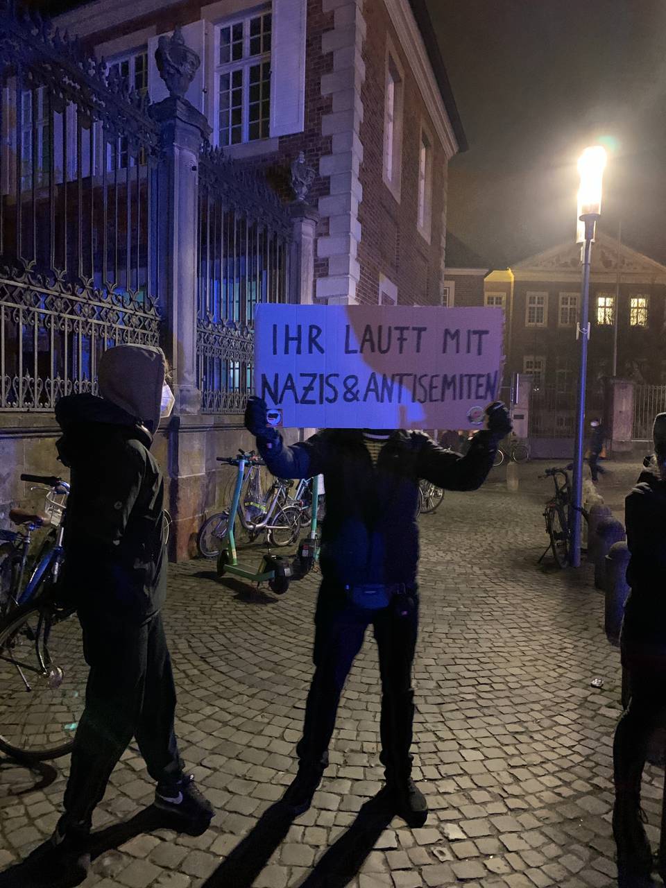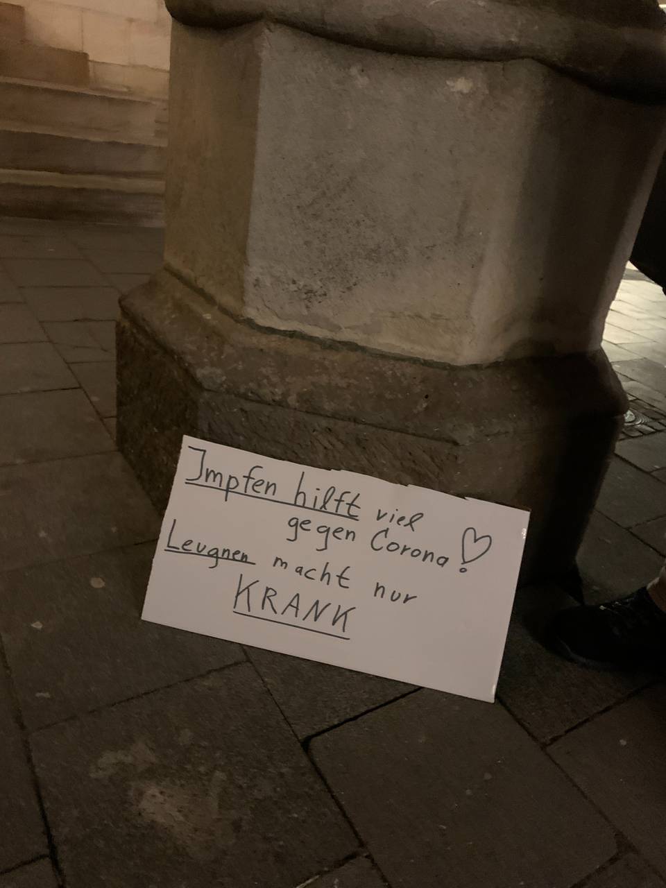 Das Bündnis „Keinen Meter den Nazis“ hatte via soziale Medien vorab zur Gegendemo aufgerufen. Um 17:30 Uhr trafen sich 250 Aktivist:innen zur Kundgebung vor dem Rathaus. Anwesend waren unter anderem Vertreter:innen der Grünen Jugend, der Jusos, der DGB und Krankenpfleger:innen von „Münster Cares“, die verschiedene Redebeiträge hielten. Dazu gehört auch Anne (41), die Krankenpflegerin auf einer Intensivstation ist und im Rahmen der Kundgebung einen Vortrag hält. Darüber, wie unerträglich die Situation auf den Intensivstation derzeit sei.