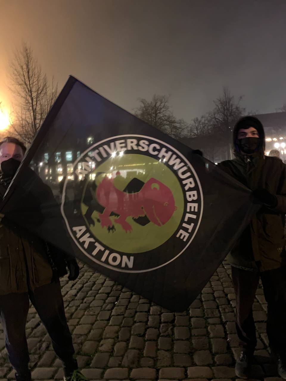 Einige Aktivist:innen liefen am Rande des "Montagsspaziergangs" mit, um ihren Unmut gegenüber den Impfskeptiker:innen auszudrücken - mit Flaggen und Sprüchen gegenüber den Demonstrierenden. Man fühle sich jedoch keinem Bündnis zugeordnet, sondern wolle privat gegen Impfverweiger:innen, Corona-Leugner:innen und Rechten vorgehen, so die Aktivist:innen.