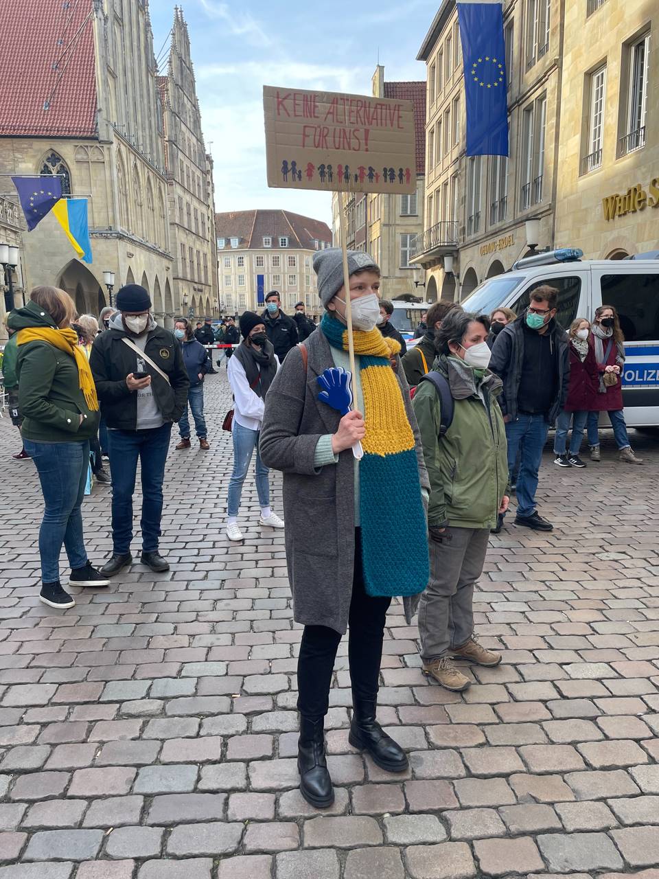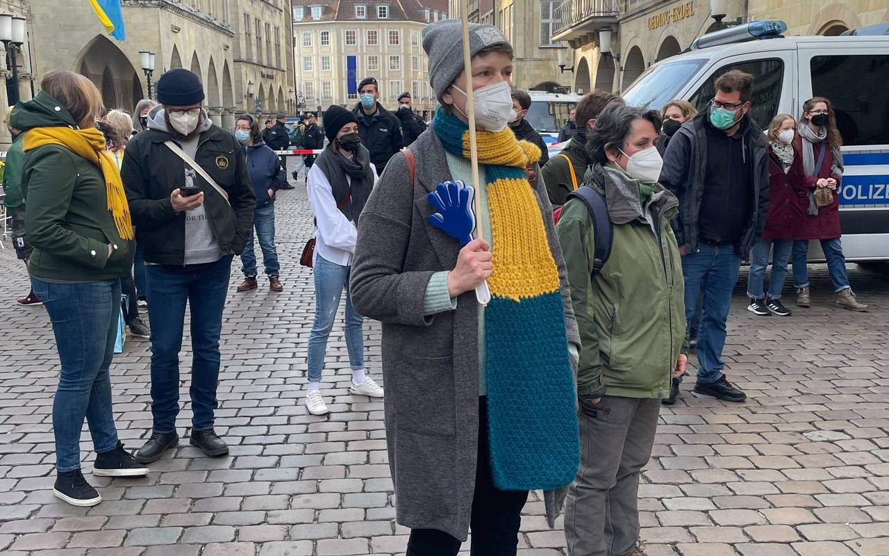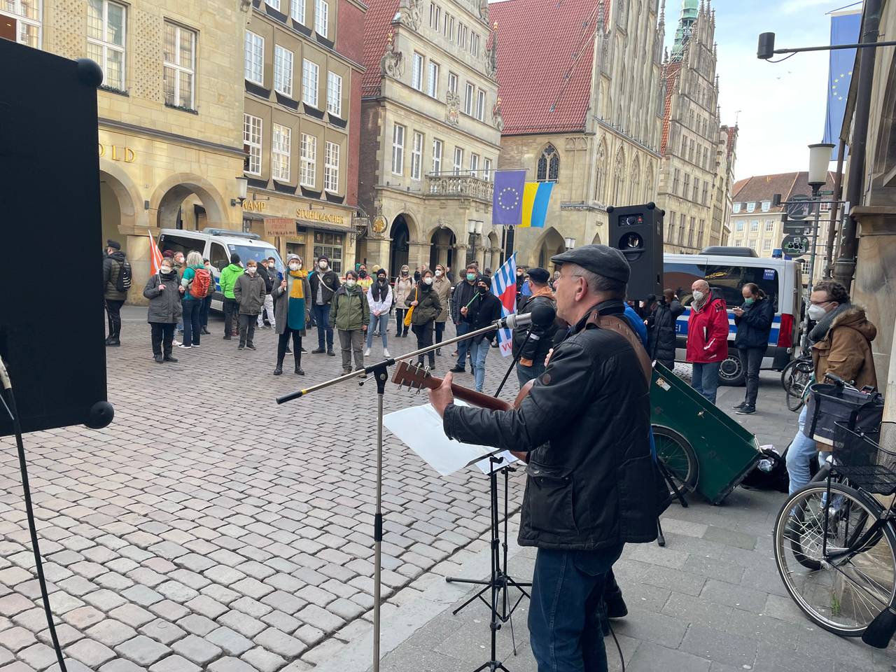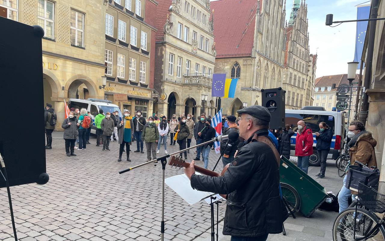 Im Anschluss haben mehrere Friedensbündnisse zu einer Demonstration auf dem Prinzipalmarkt aufgerufen. Sie wollen ein klares Zeichen für den Frieden in der Ukraine setzen. Die Resonanz fällt allerdings deutlich geringer aus als erwartet. In der Spitze hatten sich etwa 70 Menschen eingefunden, schätzt die Polizei. Erwartet waren bis zu 1.000.