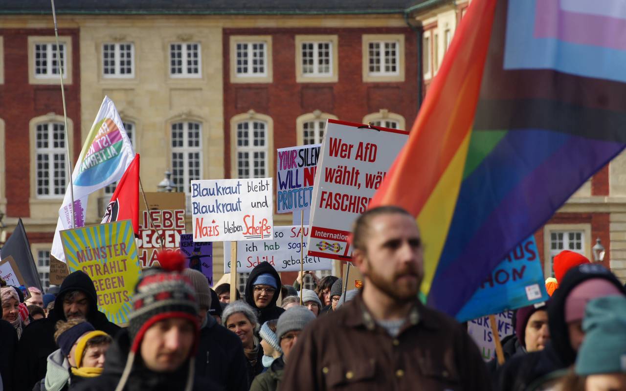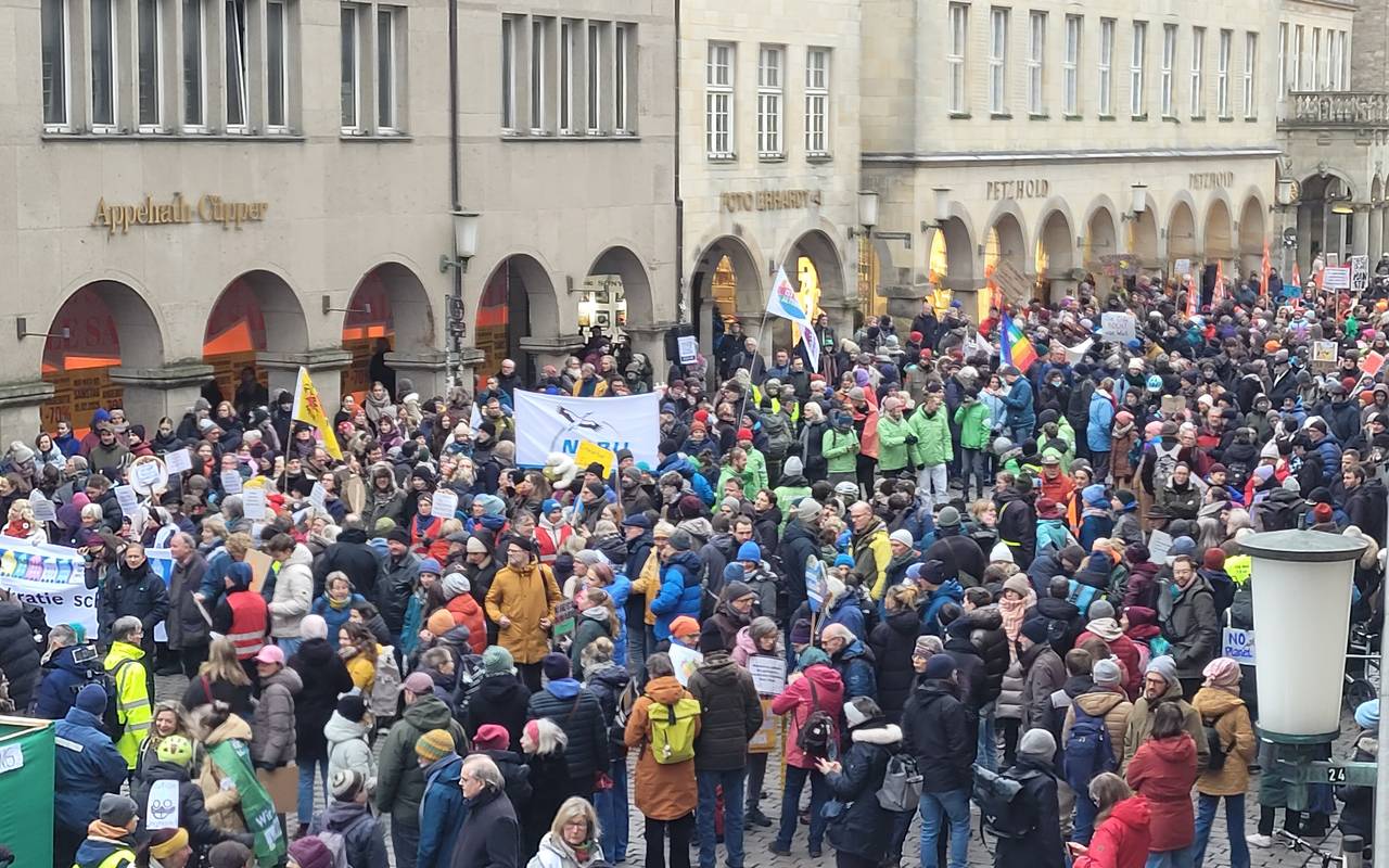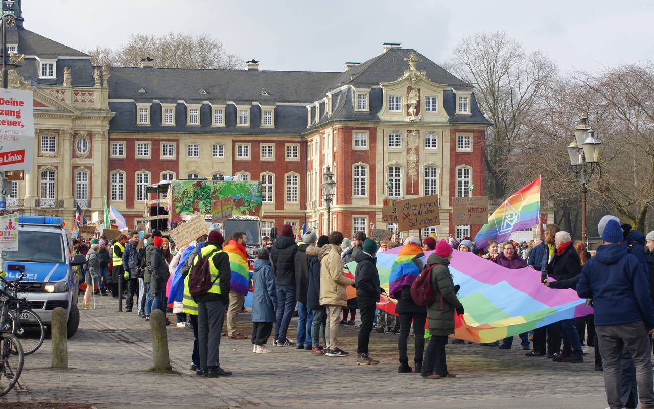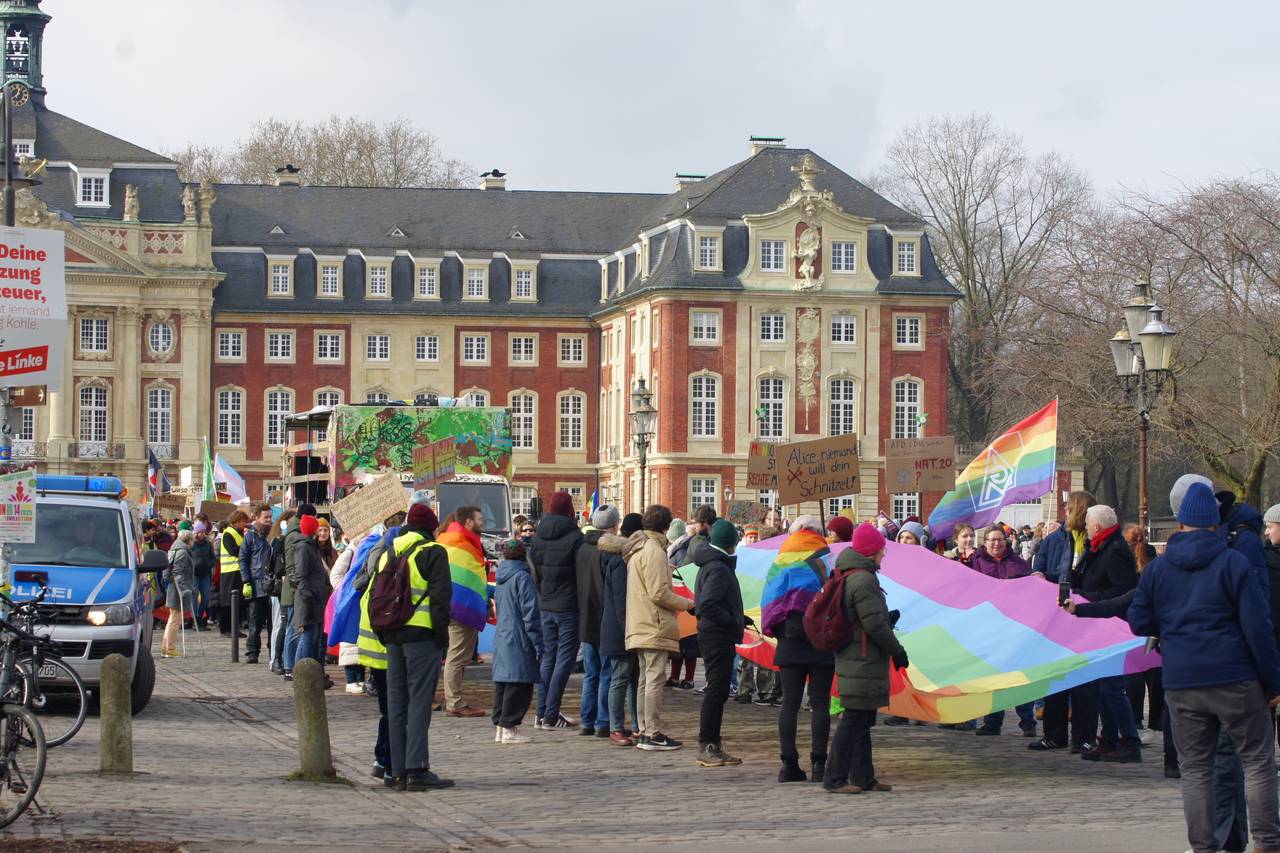 Am Samstagmittag (15.02.) haben der Christopher-Street-Day-Verein und "Keinen Meter den Nazis" unter dem Motto "Es ist 5 vor 12" zur Demo für Demokratie und Menschenrechte aufgerufen. Beginn war auf dem Schlossplatz um 11:55 Uhr. Dieser Zug zieht durch die Innenstadt am Aegidiimarkt vorbei, über den Prinzipalmarkt und den Domplatz und endet wieder am Schlossplatz. Die Veranstalter haben rund 1.000 Menschen angemeldet. Diese Anzahl hat sich laut Polizei zu Beginn der Versammlung auch schon zusammengefunden (Stand 12:30 Uhr).
