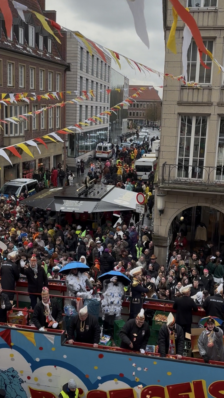 Unser Morningshow-Duo Malena Stöhler und Tino Tiede sind in der Innenstadt und feiern mit etlichen Münsteraner:innen und Gästen Rosenmontag. Inzwischen dürften sie auf dem Wagen der "bösen Geister" sein. Unter dem Motto "Karneval - eine große Familie" hat sich der Zug pünktlich um 12:11 Uhr vom Schlossplatz Richtung Prinzipalmarkt auf den Weg gemacht.