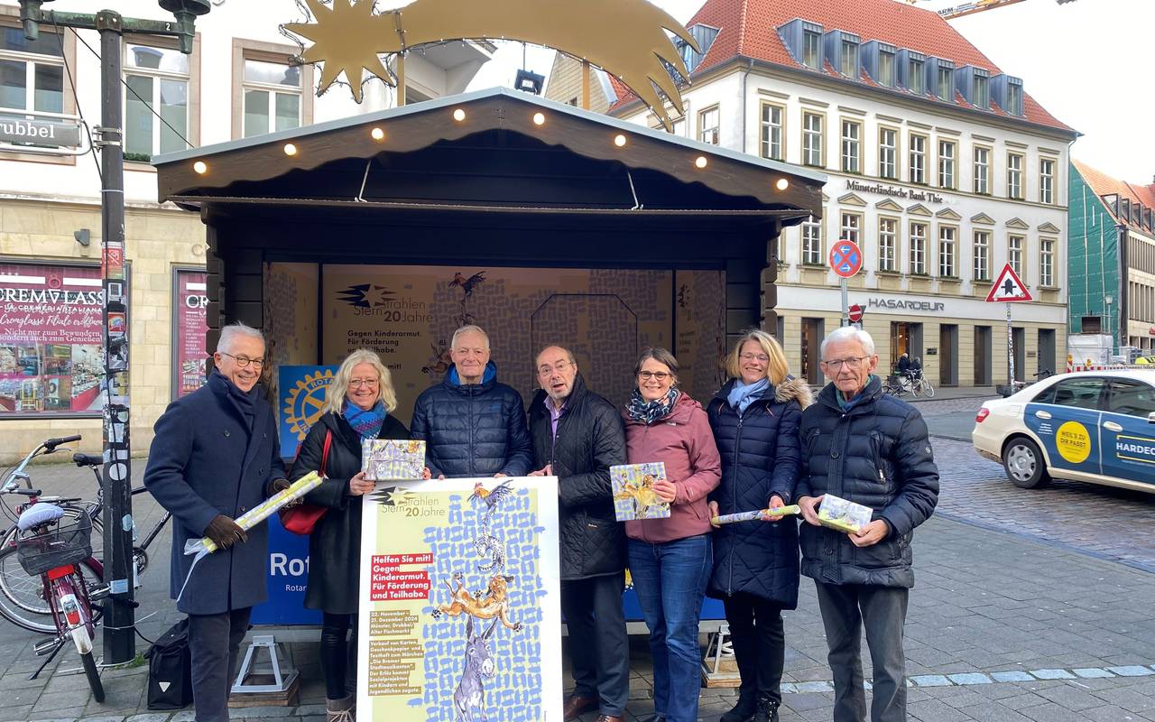 Alle münsterschen Rotary Clubs machen mit. Gegen eine Spende von mindestens fünf Euro gibt es an der Sternstrahlen-Hütte künstlerisch gestaltete Postkarten und Geschenkpapier. Motiv ist diesmal das Märchen von den Bremer Stadtmusikanten. Das Märchen gibt es als kleines Büchlein dazu. Über 40.000 Euro wollen die Rotarier bis zum 22. Dezember sammeln. Insgesamt wären dann in zwanzig Jahren Sternstrahlen mehr als 750.000 Euro für den guten Zweck zusammengekommen. Mit dem Geld organisieren Caritas und Diakonie bei uns in der Stadt u.a. Freizeit-, Theater-, Sport- und Musikprojekte für Kinder und Jugendliche.