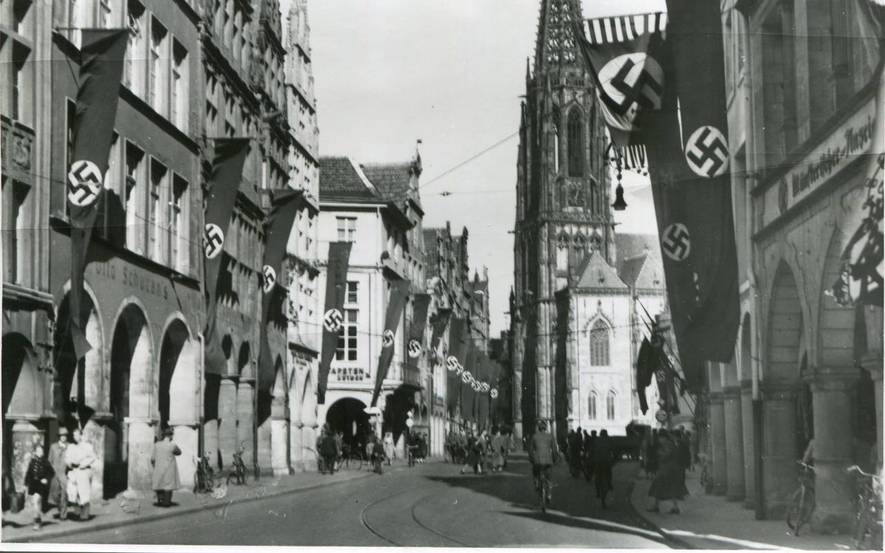 "Unsere Vorträge schauen auf Machtübernahme, Leid, Befreiung und Frieden ", erläutert Anja Gussek vom Stadtarchiv, die als Moderatorin durch die Abende führt. "Aber auch Münsters Neuanfang nach dieser epochalen Zäsur wird in den Referaten im Fokus stehen", so die Organisatorin über das Veranstaltungsformat. Im Februar entsteht das Bild einer Stadt, die ab 1933 immer mehr im "Schmuck der Hakenkreuze" steht. Dr. Annika Hartmann spricht über Feste und darüber wie Nationalsozialisten diese Anlässe nach der Machtübernahme strategisch inszenierten. Ob neue Straßennamen - am Bahnhof führte die Adolf-Hitler-Straße entlang - oder Ehrenbürgerschaften für hohe NSDAP-Köpfe: Die Gäste können an vielen Beispielen den Herrschaftsausbau nachvollziehen. Und die Funktion der Stadtverwaltung? Annika Hartmann wird auch den "Tatort Schreibtisch" unter das Brennglas legen. Von der Rolle des Rathauses in der NS-Diktatur handelt der Beitrag im März. Dann geht es um die Folgen des "totalen Krieges" auf das Handeln der städtischen Dienststellen.