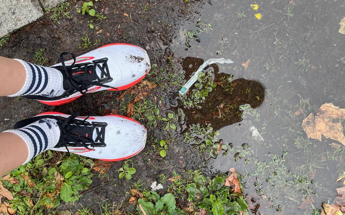 21. Juni (Lena): "Die schmutzigsten Schuhe erzählen die besten Geschichten" - das hat uns Lara von Brooks mit auf den Weg gegeben. Was trifft sich da besser, als nach den Regengüssen der vergangenen Tage mit den neuen, weißen (!) Schuhen zwei Runden um die Promenade zu düsen? Vom Laufgefühl her hat es sich mit den neuen Schuhen natürlich besser angefühlt als mit meinen abgetragenen Laufschuhen davor. Trotzdem merkt man, dass sich die Beinchen an die neuen Schuhe gewöhnen müssen. Ich freue mich, in den nächsten Wochen noch mehr Schlammspritzer auf meinen neuen Tretern zu sammeln. Do it for the plot!