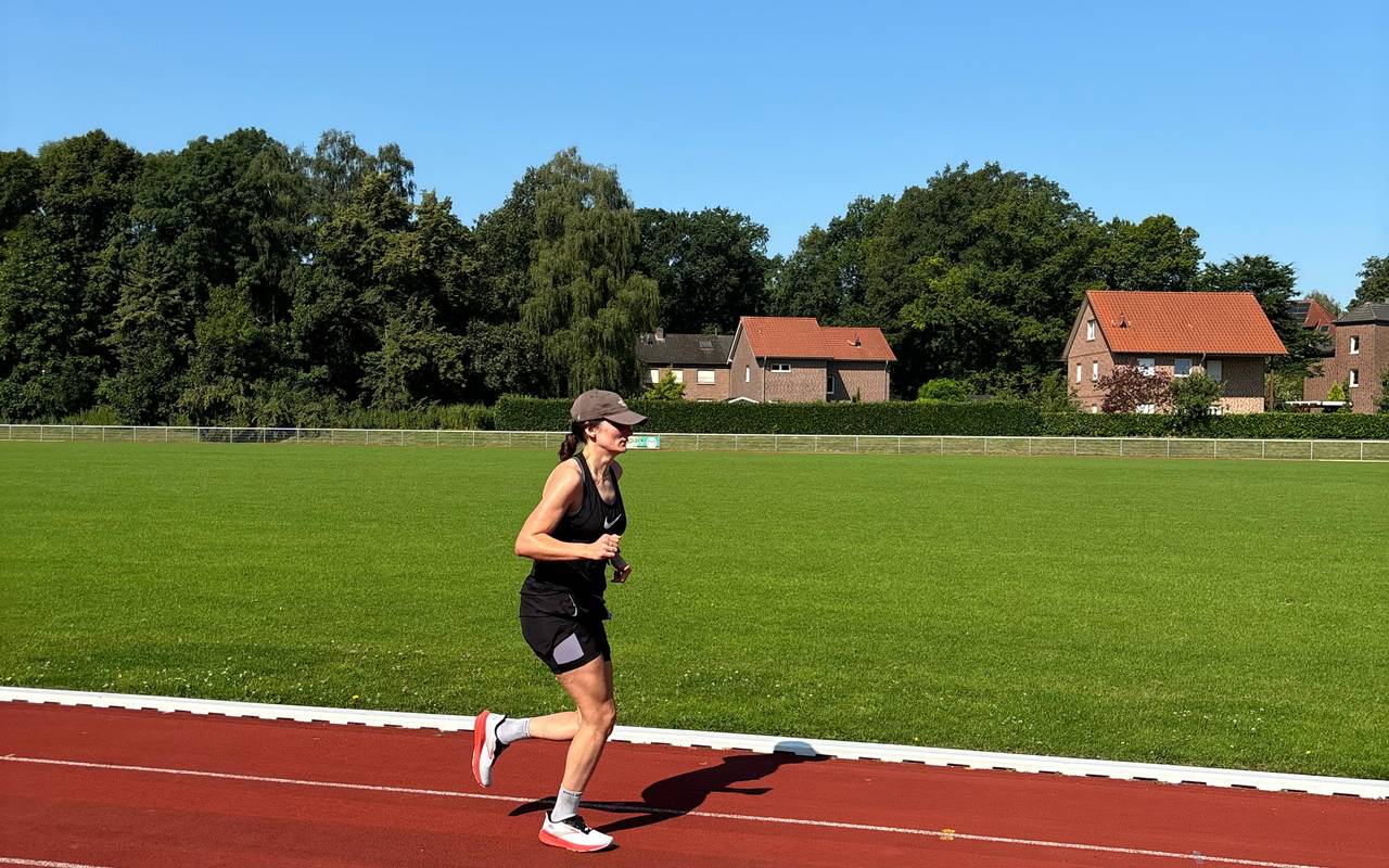 20. Juli (Lena): "Fußball ist echt gefährlich", da hat meine liebe Kollegin Christina wohl Recht. Nachdem ich längere Zeit mit Knieproblemen zu kämpfen hatte, hatte ich mir im Saisonendspurt eine leichte Oberschenkelzerrung zugezogen und musste das Lauftraining erstmal pausieren. Jetzt bin ich aber wieder fit und sehr motiviert, bis September mindestens drei mal die Woche zu trainieren. Tipps dazu habe ich mir bei Michael Brinkmann vom Münster Marathon geholt: einmal die Woche einen längeren, aber dafür langsamen Lauf, einen ambitionierten Lauf und einmal Intervalltraining. Zum Start gab es an diesem Wochenende eine Intervalleinheit, die es in sich hatte. Zum Glück ist das Foto während des ersten von insgesamt neun Intervallen entstanden... Auch wenn es während der schnellen Phasen die Hölle war, fühle ich mich nach dem Training meistens echt gut und freue mich auf die nächsten Wochen.