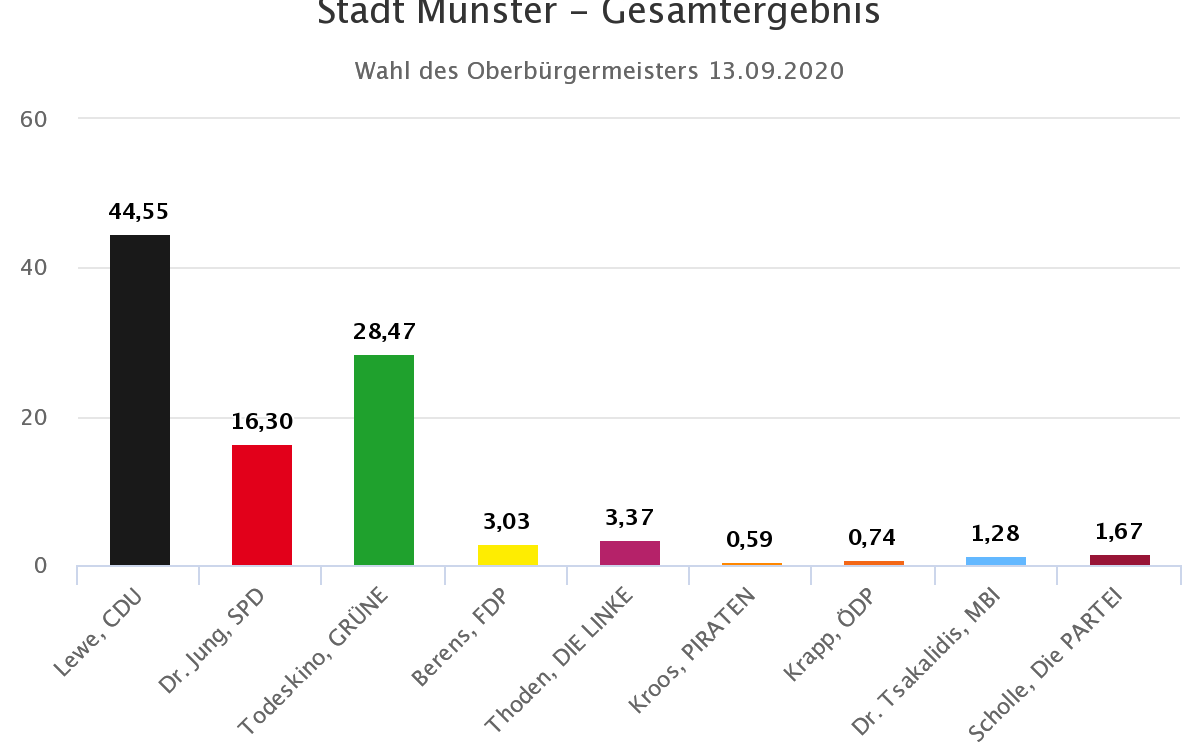 Es waren von Anfang an die Favoriten: Am 27. September tritt Peter Todeskino von den Grünen gegen den amtierenden Oberbürgermeister Markus Lewe in der Stichwahl um das Amt des Oberbürgermeisters an. "Wir sind froh, dass wir so weit gekommen sind", sagt Peter Todeskino im ANTENNE MÜNSTER-Interview. Dr. Michael Jung von der SPD landete weit abgeschlagen auf dem dritten Platz. Die übrigen Oberbürgermeisterkandidaten kommen jeweils nicht über 4% der Stimmen. Die Wahlbeteiligung lag bei knapp über 60% und ist damit ähnlich hoch wie bei der Kommunalwahl im Jahr 2014 (59,7%)