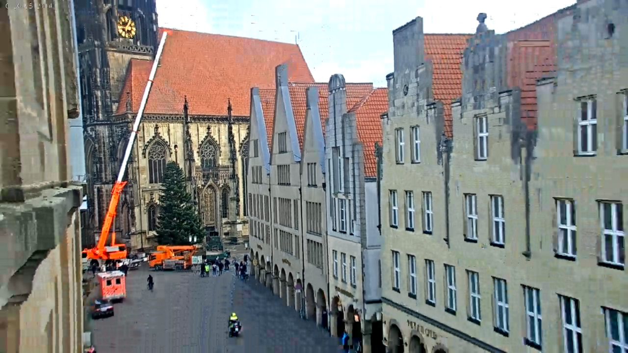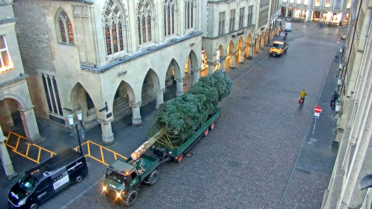 Über den Livestream vom Prinzipalmarkt konntet ihr selbst live verfolgen, wie die Tanne aufgestellt wurde und jetzt steht. Um kurz nach sieben war Baumexperte Hubertus Wilmers, der die Tanne ausgesucht hatte, in Gremmendorf losgefahren. Gegen kurz vor acht kam er mit der Tanne auf seinem Tieflader auf dem Prinzipalmarkt an. Kurz vor halb neun war der Verlader dann vor der Lambertikirche. Ab kurz nach 9 wurde die Tanne langsam aufgerichtet. ANTENNE MÜNSTER-Hörerin Kerstin hatte sie schon auf dem Weg dahin auf der Hammer Straße entdeckt - und eine Sprachmemo an die 0251/289540 gesendet.