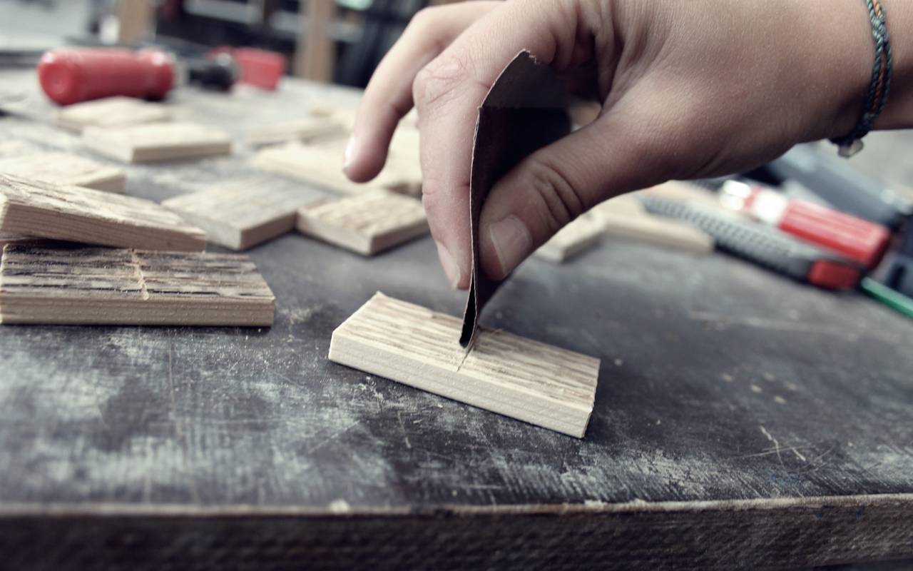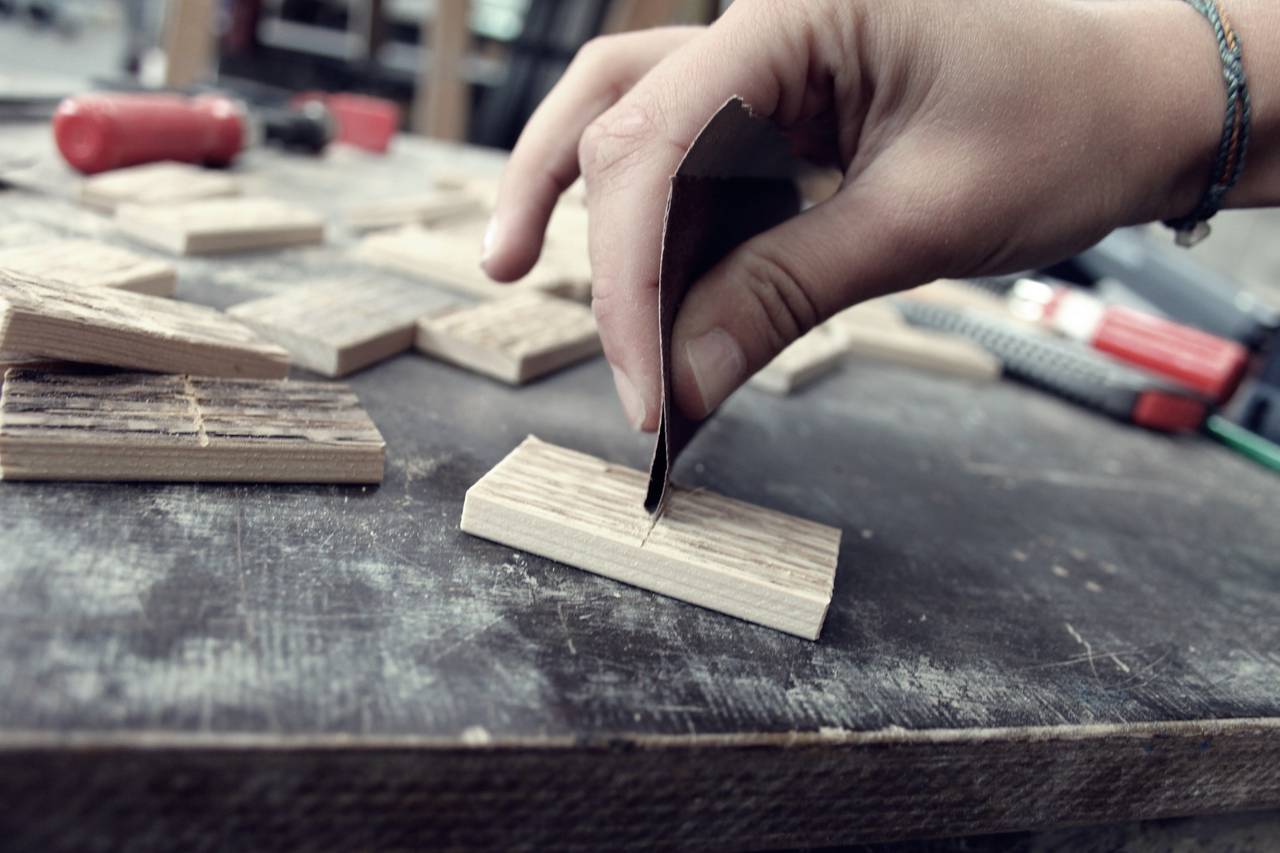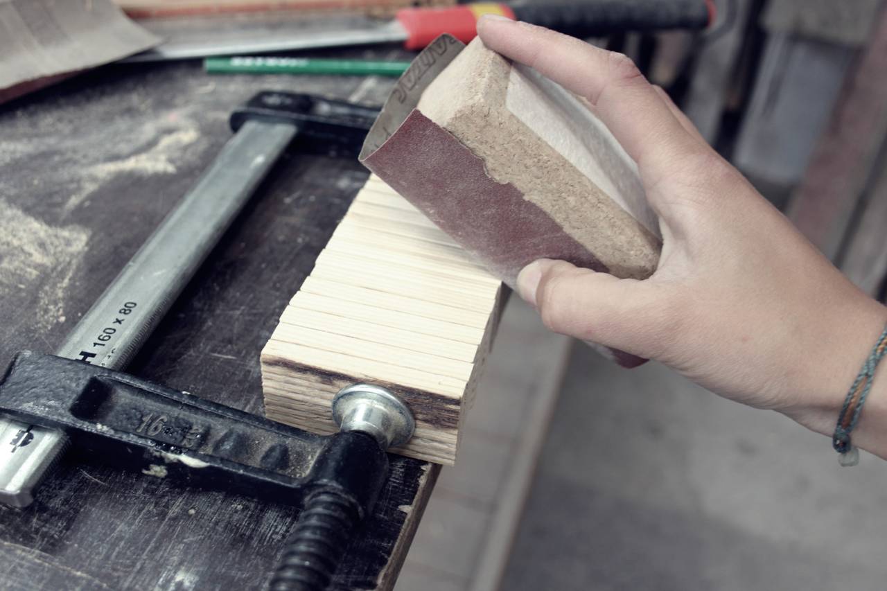 Bevor ihr anfangt, könnt ihr die Holzleisten schleifen und die Kanten leicht brechen. Das spart ihr euch dann nachher bei jedem einzelnen Dominostein.