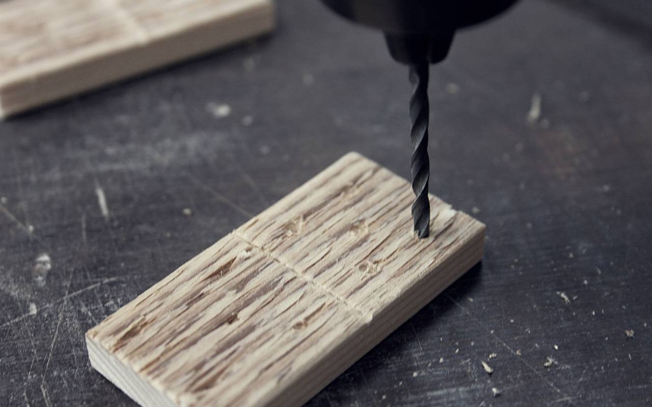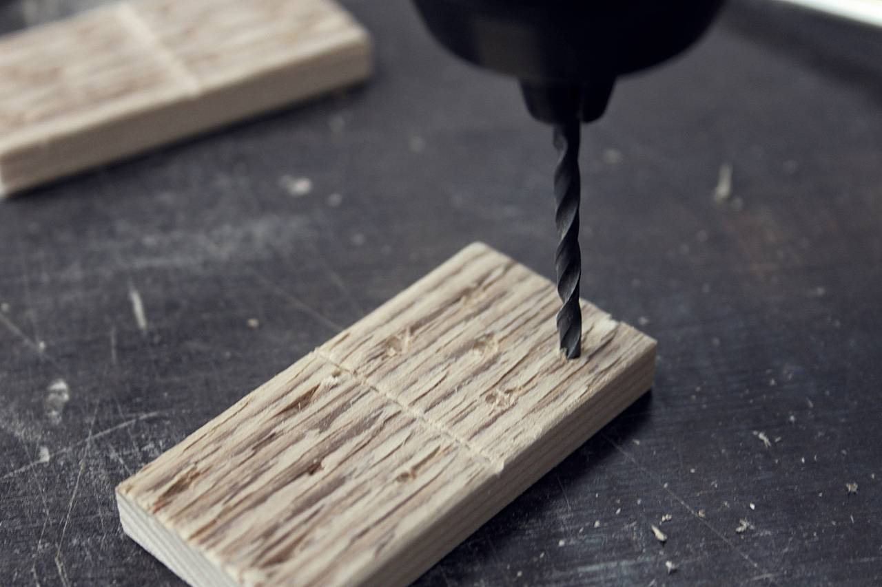 Dort setzt ihr den Bohrer an und bohrt langsam eine kleine Mulde in das Holz, nur ganz wenig, sodass man es gerade sehen und fühlen kann.