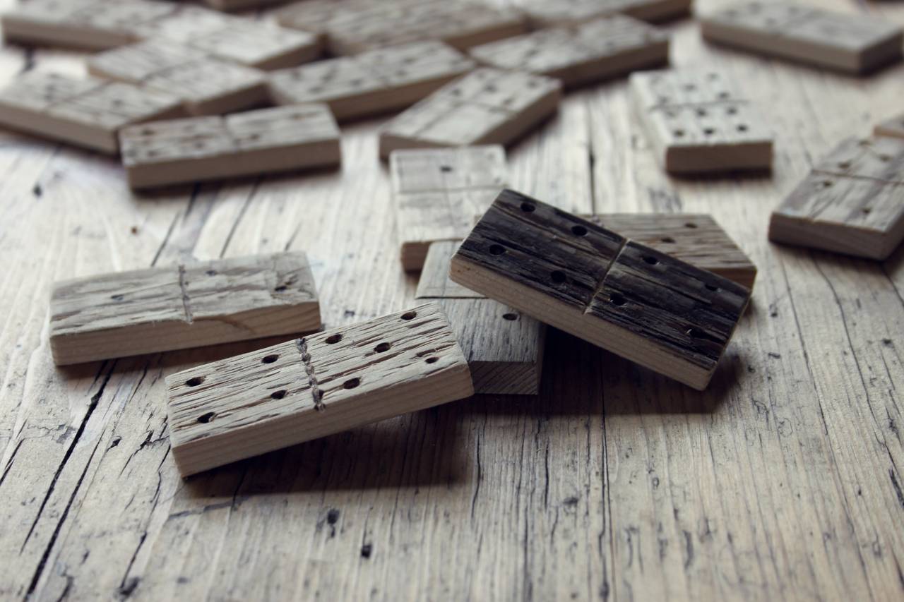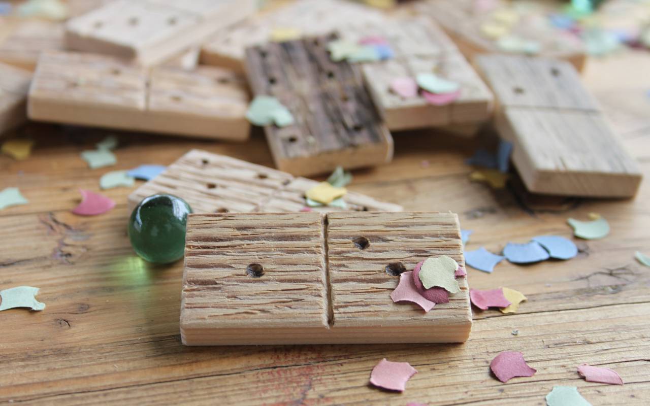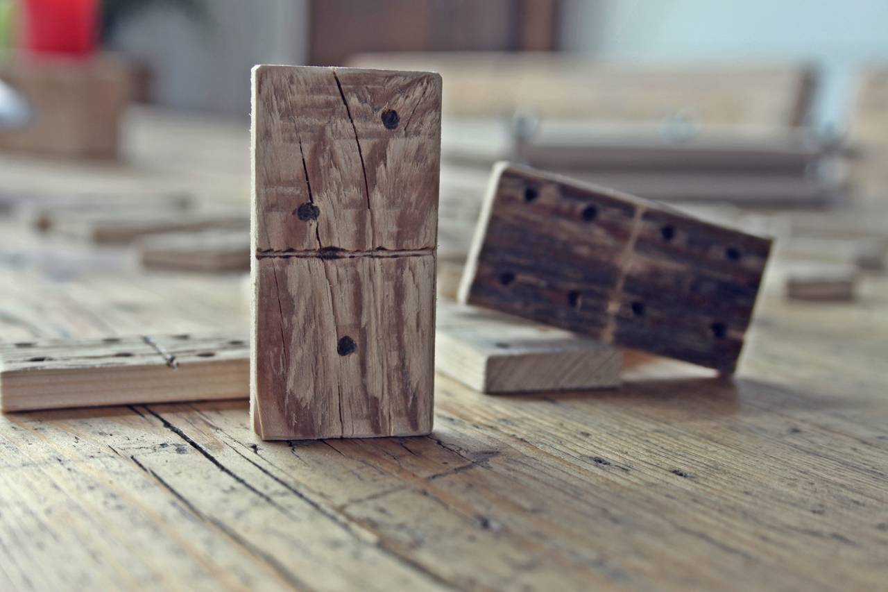 Fertig sind eure selbstgebauten Dominosteine! Abschließend könnt ihr alles mit dunkler Farbe oder kunterbunt nachziehen. Mit einem Lötkolben lassen sich die Punkte auch ganz einfach einbrennen.