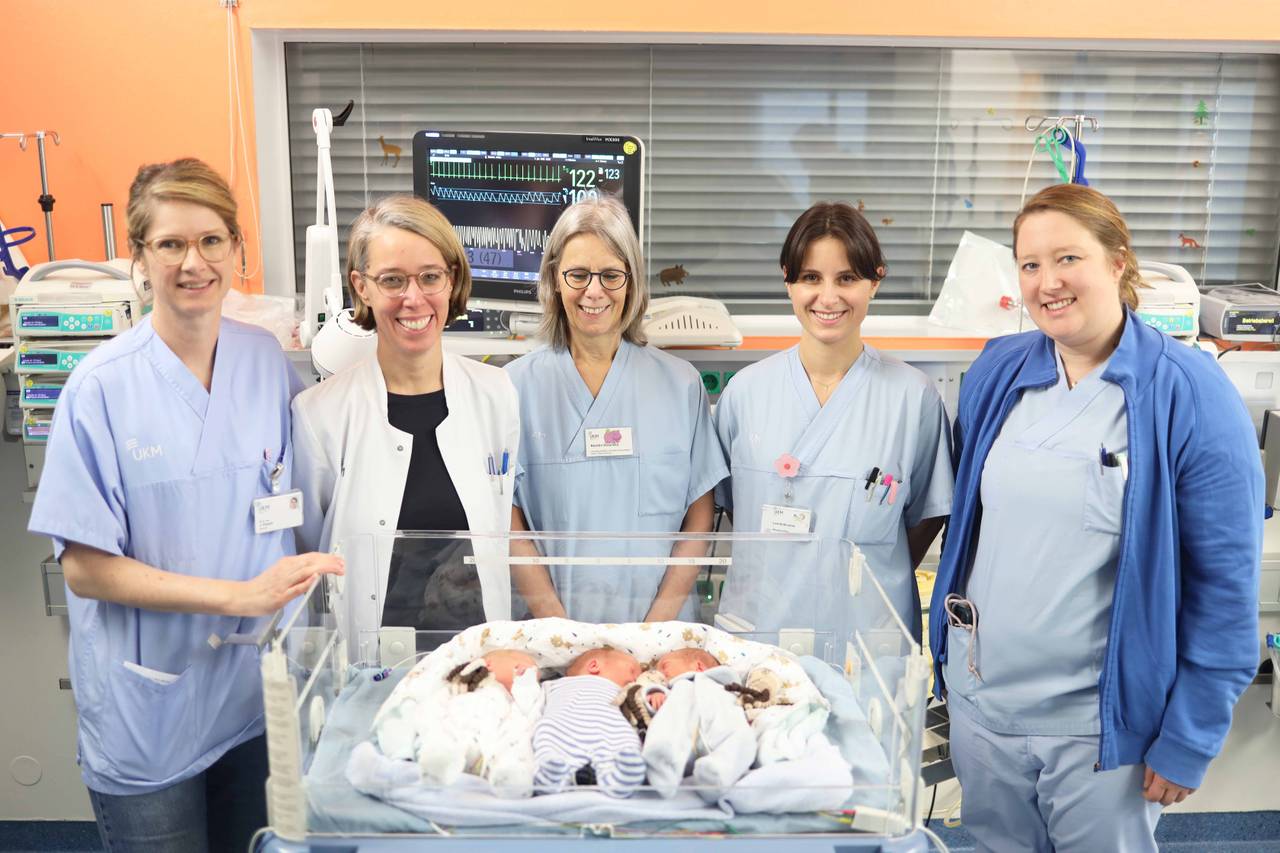 "Drei am 3. Januar": Für die UKM Geburtshilfe ist der Jahresauftakt mit der glücklichen Geburt des ersten Drillingspärchens des Jahres unbedingt gelungen. Malte, Jakob und Felix heißen die drei, die in der 35. Schwangerschaftswoche bei guter Gesundheit vorsorglich per Kaiserschnitt auf die Welt geholt wurden. "Mit rund 2.000 Gramm Geburtsgewicht sind alle drei Jungen wohlauf und bleiben aufgrund der frühen Geburt noch zur Überwachung auf der Frühgeborenenstation", sagt Oberärztin Priv.-Doz. Dr. Jenny Potratz, aus der Neonatologie und pädiatrischen Intensivmedizin am UKM (Universitätsklinikum Münster). Auch ihre Kollegin Priv.-Doz. Dr. Mareike Möllers, Leiterin der UKM Geburtshilfe, die die werdenden Eltern seit der siebten Schwangerschaftswoche engmaschig betreut hat, ist froh, dass die Geburt reibungslos verlief. Beide Medizinerinnen sind Teil des großen Teams des Perinatalzentrums Level 1 plus am UKM, wo neben frühesten Frühgeburten und Risikogeburten insbesondere auch Mehrlingsgeburten bestens aufgehoben sind.
