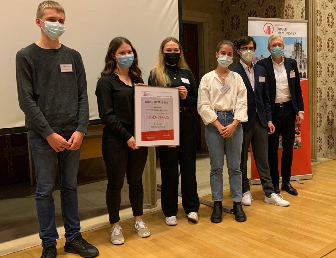 Der Verein "Ein Rucksack voll Hoffnung - für Münster" unterstützt wohnungslose Menschen. Die Initiative erhielt den mit 5.000 Euro dotierten Bürgerpreis in Gold (s.Foto oben). Das Projekt - von Münsteraner Schülerinnen und Schülern gegründet - engagiert sich mit rund 60 ehrenamtlichen Helfern. Sie wollen mit Obdachlosen ins Gespräch kommen, sie mit dem Nötigsten unterstützen und sich für sie in der Öffentlichkeit einsetzen. Im Winter werden jeden Sonntag 70 Obdachlose aus unserer Stadt mit notwendigen Dingen, z.B. warmer Kleidung, versorgt. Darüber hinaus bietet der Verein auch Unterrichtsreihen in Schulen an, um dem Thema mehr Öffentlichkeit zu geben.
