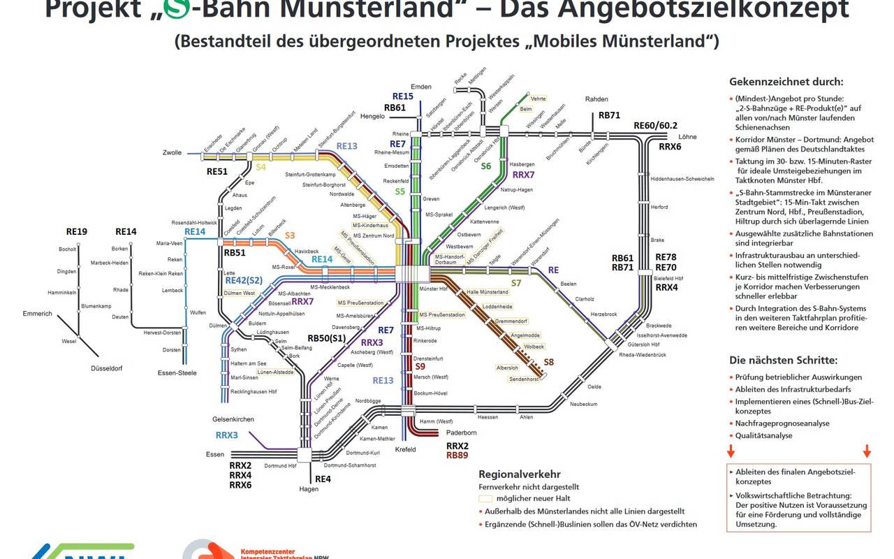 In Münster und dem Münsterland sind täglich Hundertausende unterwegs. Viele nutzen die Schiene, um möglichst sicher und bequem an ihr Ziel zu gelangen. Um in Zeiten steigender Bevölkerungszahlen und Mobilität den Menschen in der Region weitere Angebote im Schienennahverkehr machen zu können, haben die Stadt Münster und die Münsterland-Kreise Borken, Coesfeld, Steinfurt und Warendorf gemeinsam mit dem Zweckverband Nahverkehr Westfalen-Lippe (NWL) ein Konzept "Münsterland S-Bahn" auf den Weg gebracht.