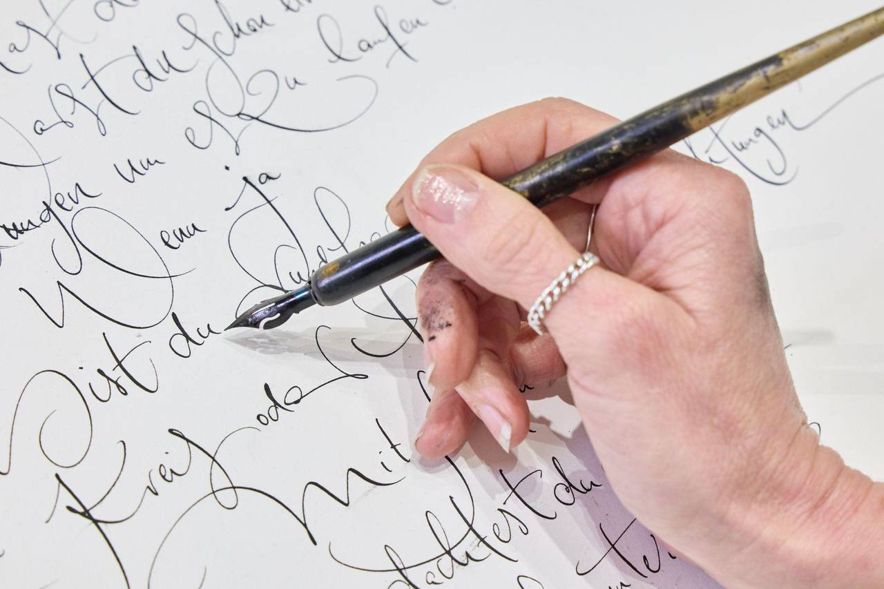 Ein Lieblings-Schreibgerät hat sie dabei nicht. «Man kann ja echt mit allem schreiben.» Probleme in den Händen hat sie auch nach langer Arbeit nicht: «Im Gegenteil. Wenn ich erst mal im Flow bin, dann vergesse ich die Zeit und ich kann 20 Stunden am Stück schreiben, ohne dass ich aufhöre. Ja, ich liebe auch dieses Geräusch, wie die Feder über das Papier kratzt. Ich finde das so toll.»