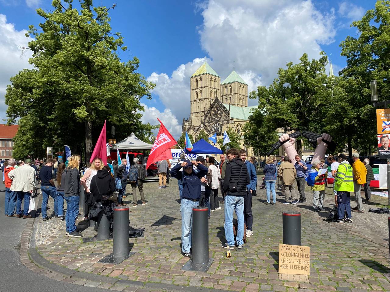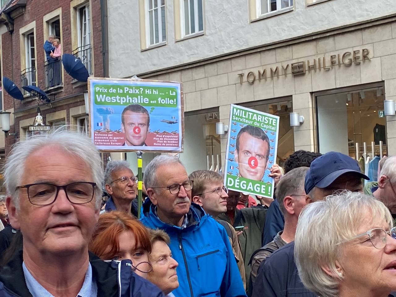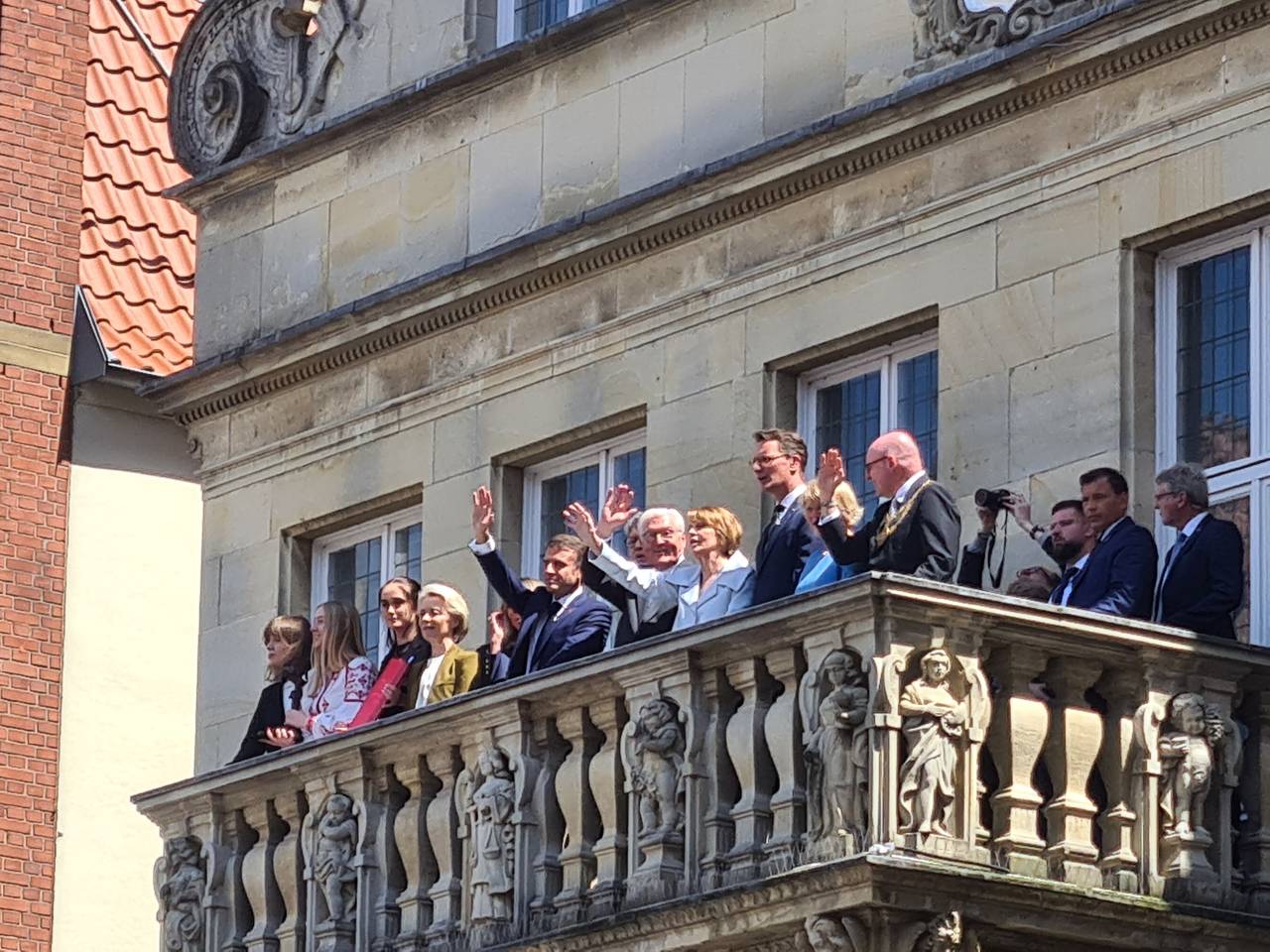 "Au revoir monsieur le president". Zum Abschluss des Staatsbesuchs in Münster sind Emmanuel Macron und Frank-Walter Steinmeier im Schloss Wilkinghege noch einmal kurz vor die Presse getreten und haben sich herzlich umarmt. Und dann hieß es auch schon wieder Abschied nehmen von Münster. Macron flog zu weiteren Gesprächen noch einmal nach Berlin, aber mit dem Preis des Westfälischen Friedens im Gepäck. Im Kopf die Bilder vom Prinzipalmarkt mit jubelnden Menschen darauf. Aber auch mit kritischen Plakaten, die einige Besucher:innen dabei hatten. Die Polizei meldet ruhige Protestveranstaltungen, ohne Probleme.