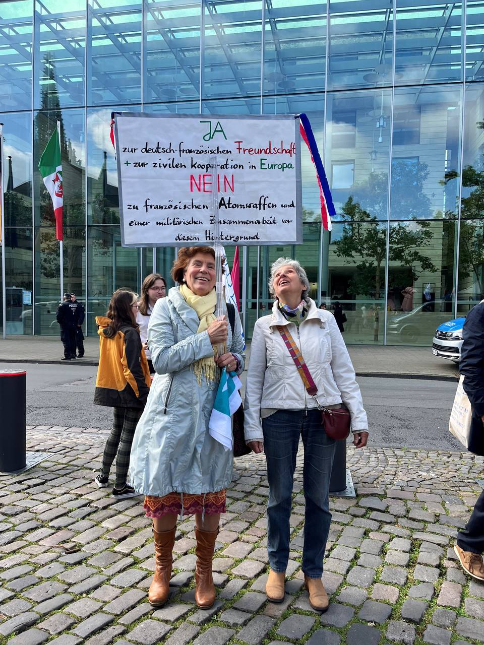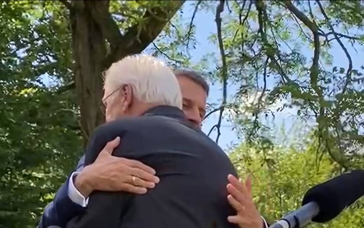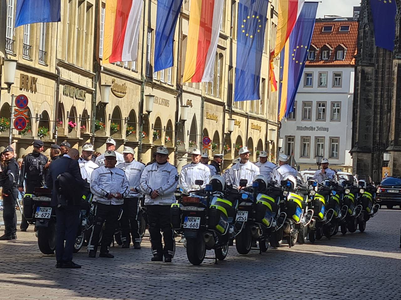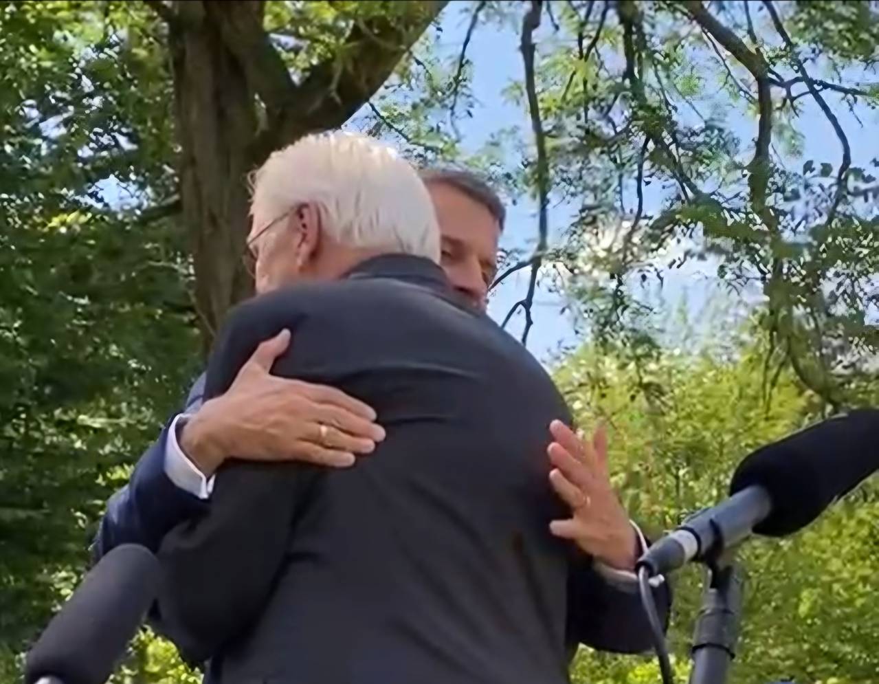 "Au revoir monsieur le president". Zum Abschluss des Staatsbesuchs in Münster sind Emmanuel Macron und Frank-Walter Steinmeier im Schloss Wilkinghege noch einmal kurz vor die Presse getreten und haben sich herzlich umarmt. Und dann hieß es auch schon wieder Abschied nehmen von Münster. Macron flog zu weiteren Gesprächen noch einmal nach Berlin, aber mit dem Preis des Westfälischen Friedens im Gepäck. Im Kopf die Bilder vom Prinzipalmarkt mit jubelnden Menschen darauf. Aber auch mit kritischen Plakaten, die einige Besucher:innen dabei hatten. Die Polizei meldet ruhige Protestveranstaltungen, ohne Probleme.