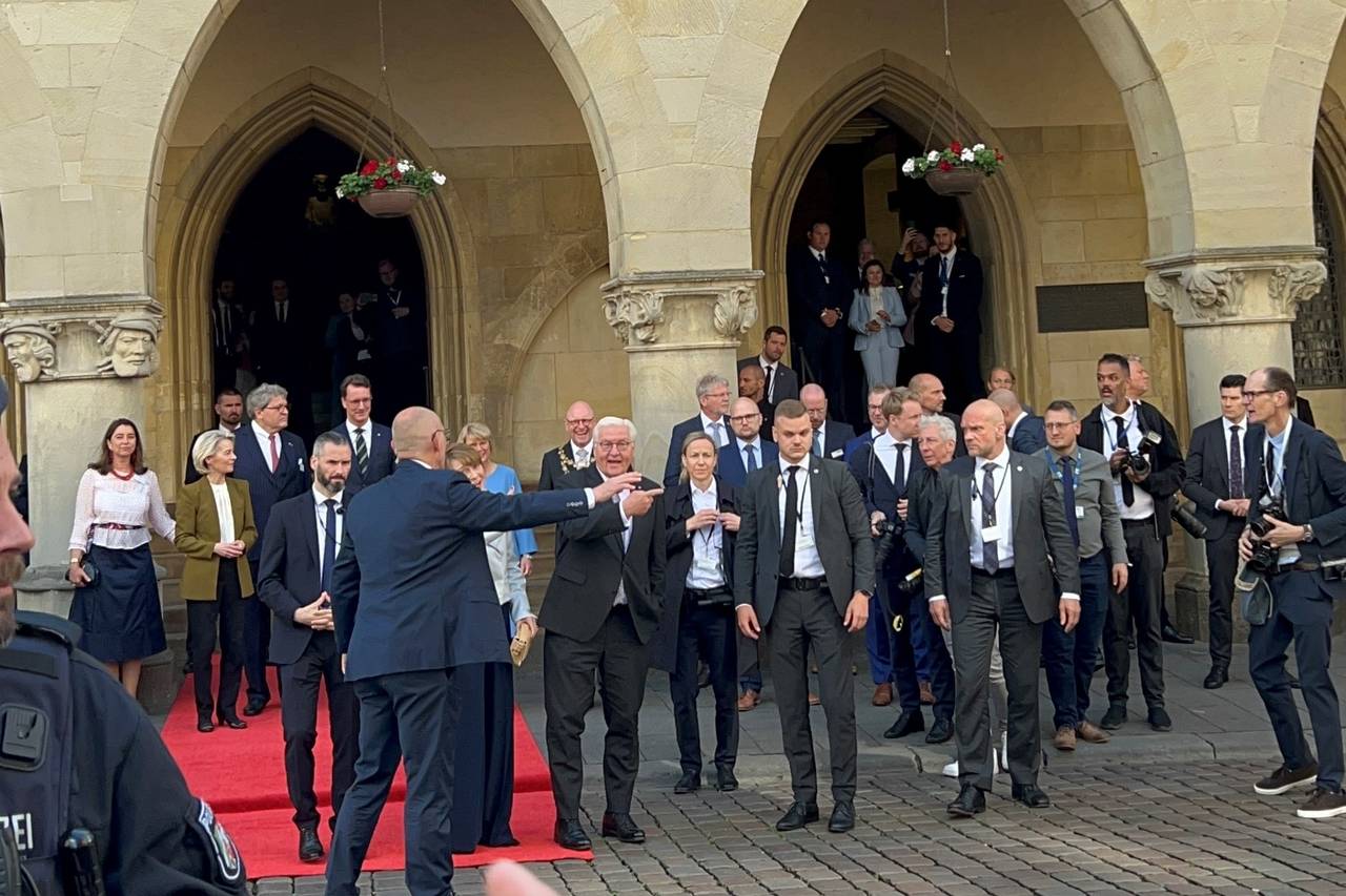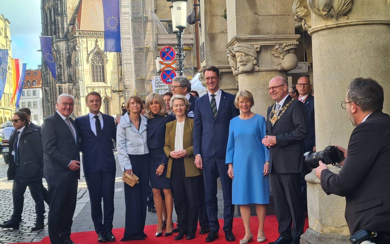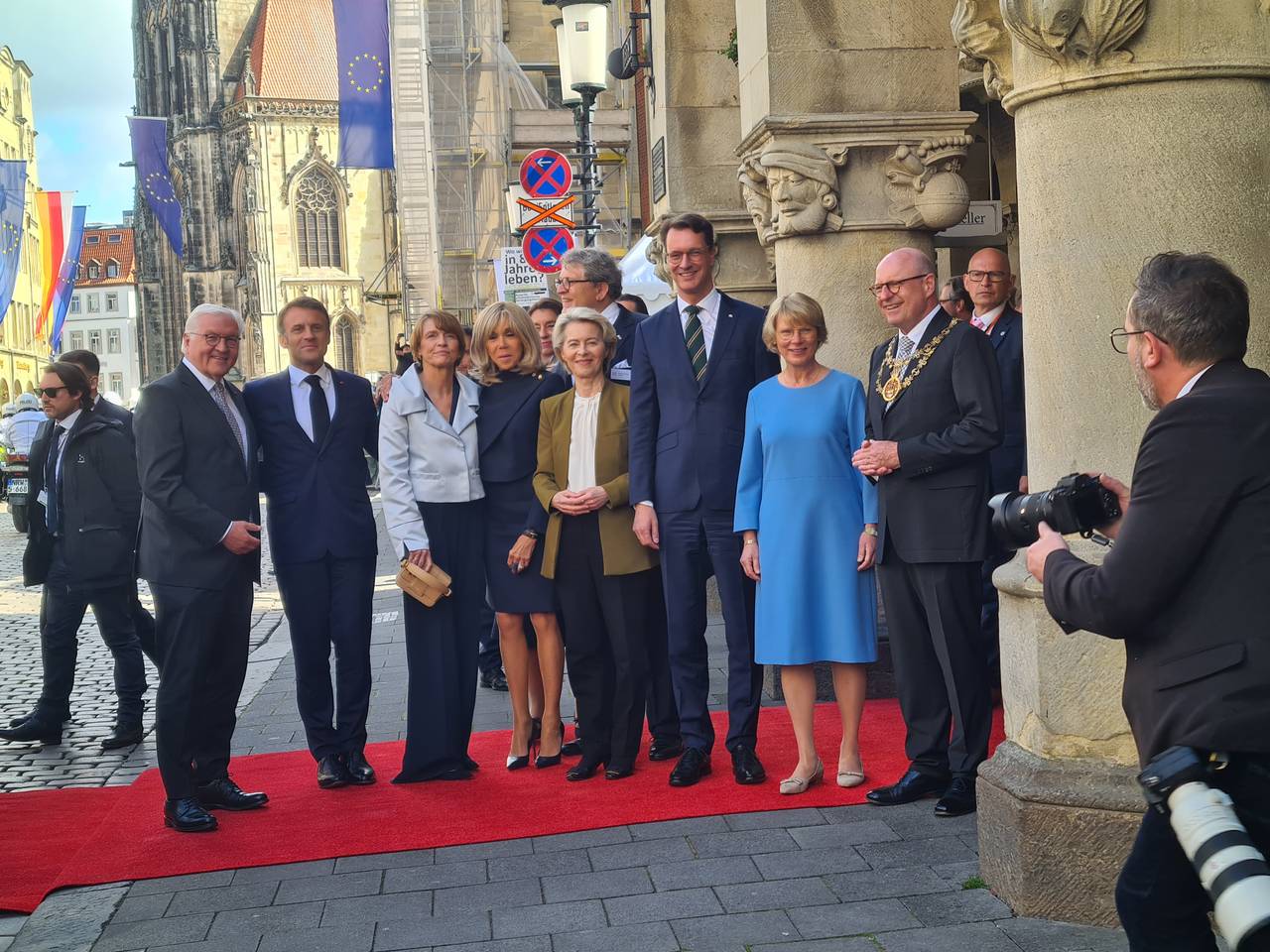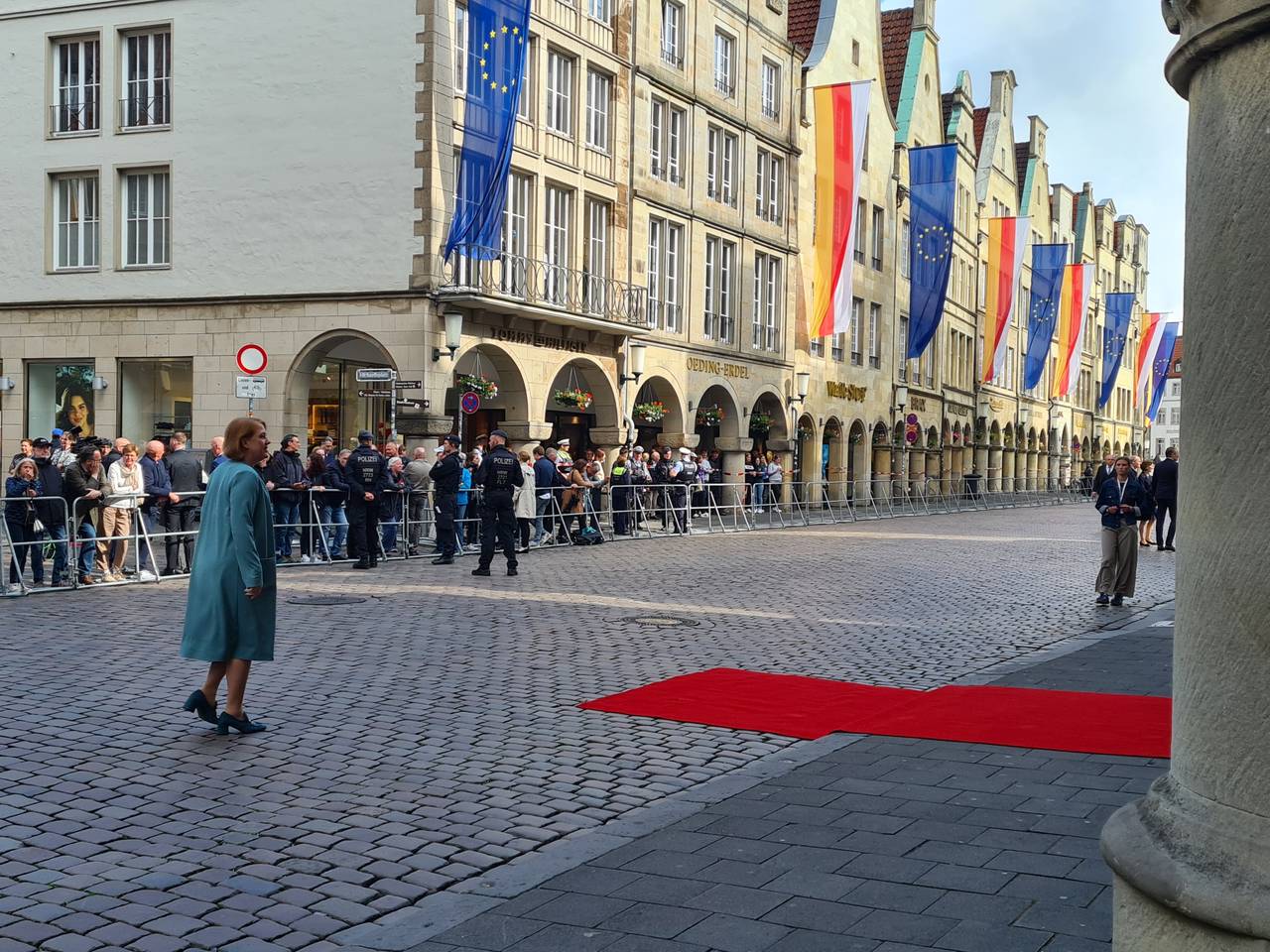 Die Begrüßung vor dem Rathaus war herzlich. Kurz nach 11:00 Uhr rollte die französische Staatskarosse über den Prinzipalmarkt. Macron und seine Gattin stiegen aus, unter anderem empfangen von Bundespräsident Steinmeier, Münsters Oberbürgermeister Lewe, EU-Kommissionspräsidentin von der Leyen und NRW-Ministerpräsident Wüst. Nach dem Lächeln für die Fotos und dem Winken in die Menge ging es dann ins historische Rathaus. Dort haben die Reden und die Verleihung begonnen, etwas später als geplant.