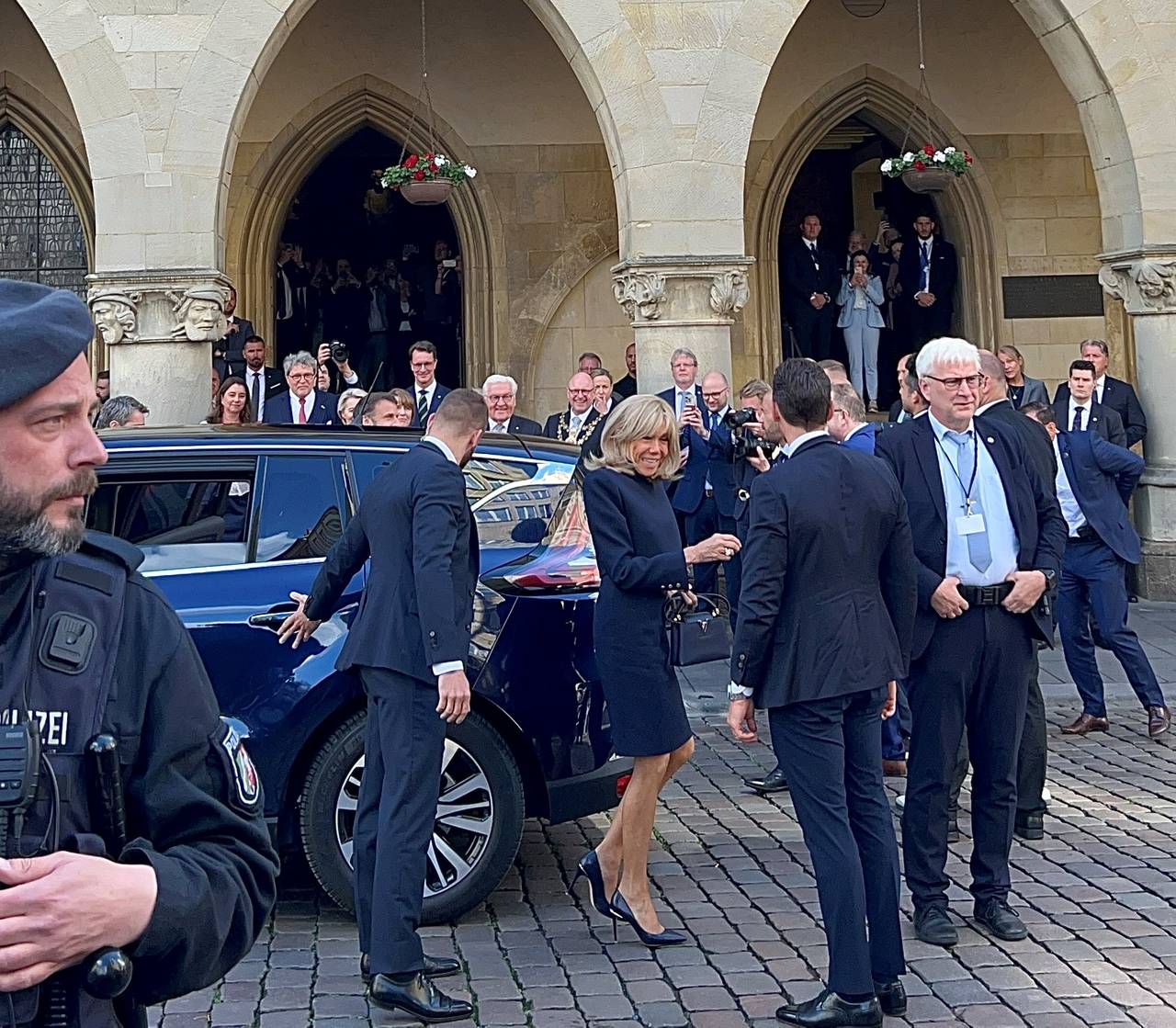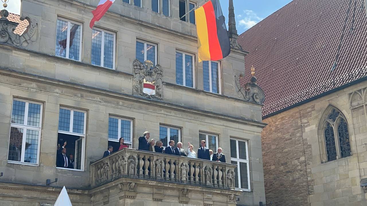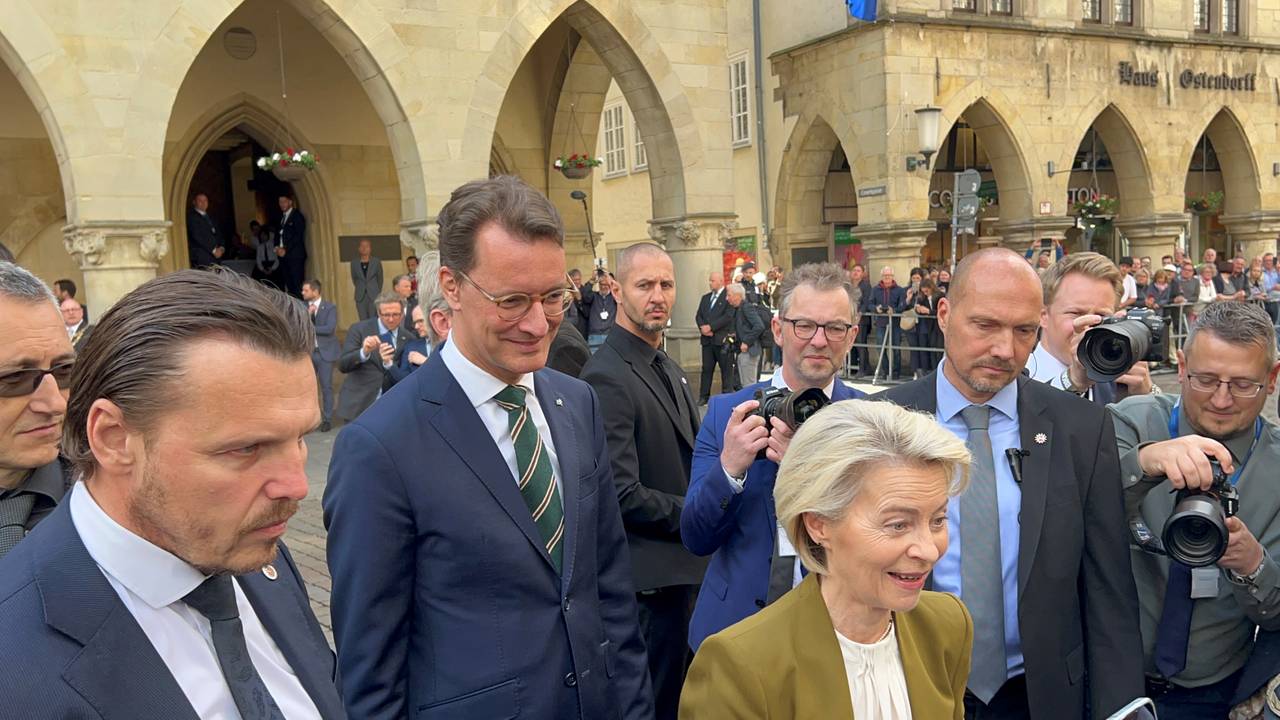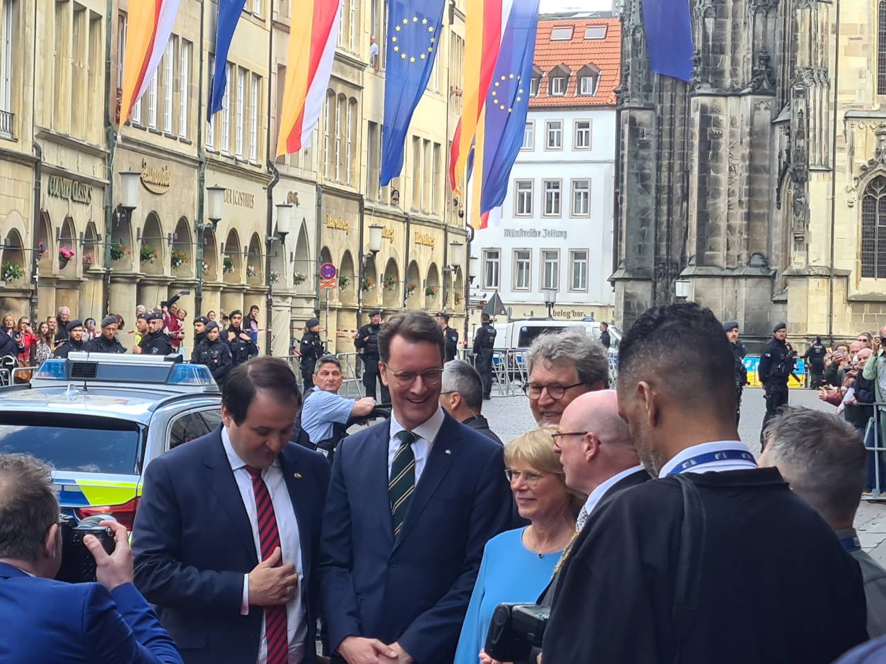 Die Begrüßung vor dem Rathaus war herzlich. Kurz nach 11:00 Uhr rollte die französische Staatskarosse über den Prinzipalmarkt. Macron und seine Gattin stiegen aus, unter anderem empfangen von Bundespräsident Steinmeier, Münsters Oberbürgermeister Lewe, EU-Kommissionspräsidentin von der Leyen und NRW-Ministerpräsident Wüst. Nach dem Lächeln für die Fotos und dem Winken in die Menge ging es dann ins historische Rathaus. Dort haben die Reden und die Verleihung begonnen, etwas später als geplant.