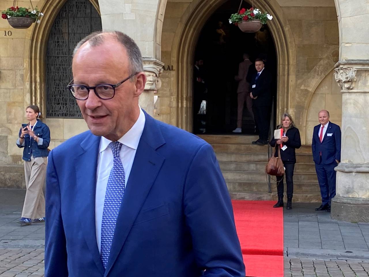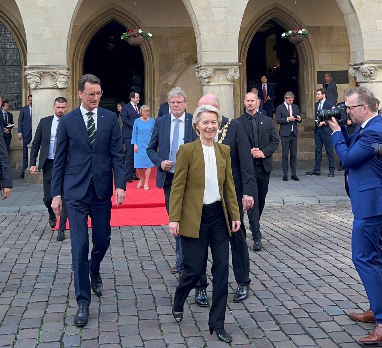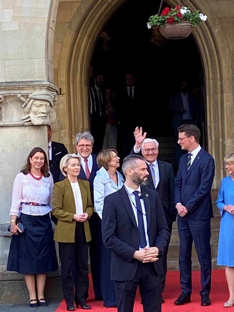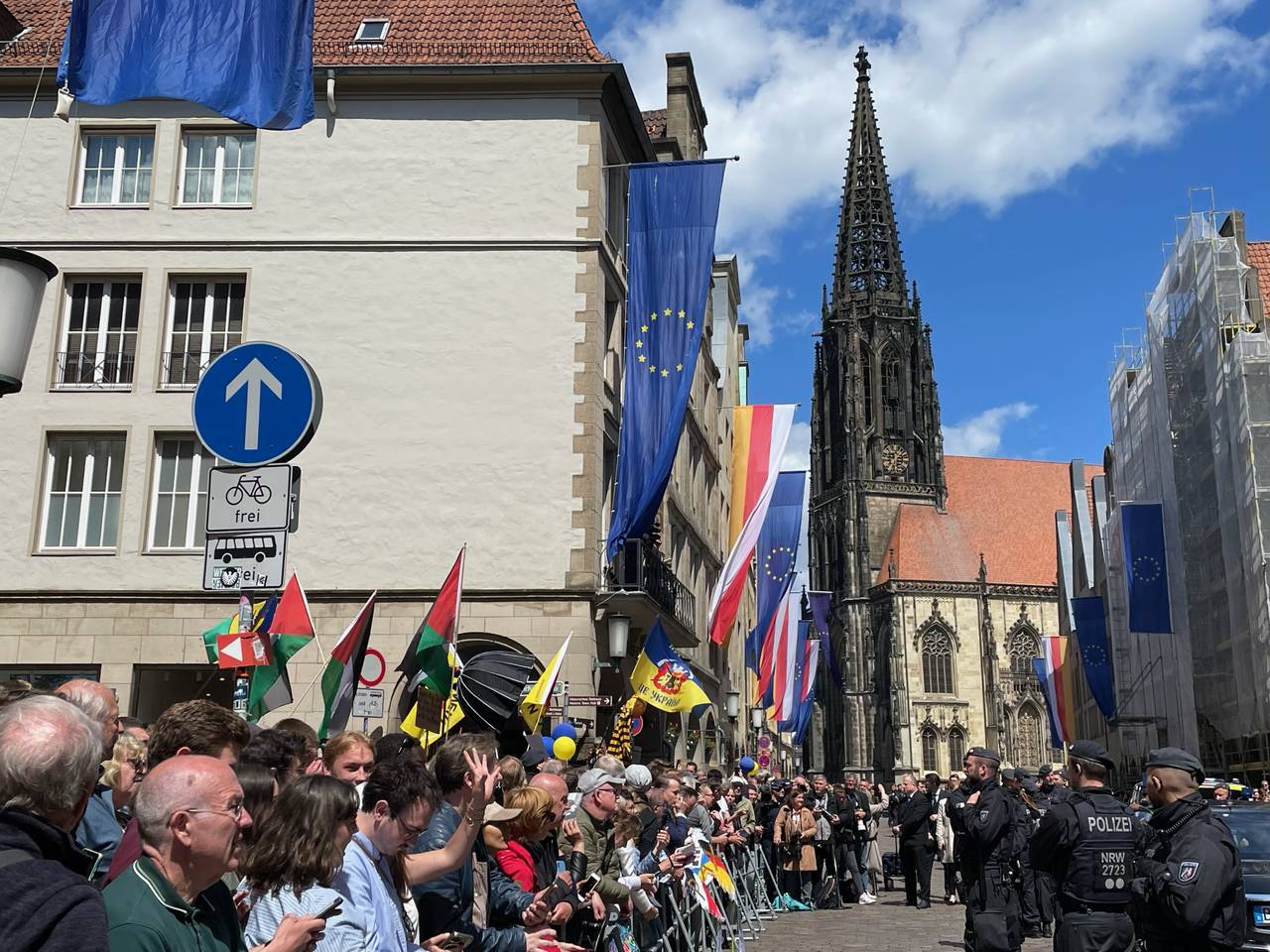 Die Begrüßung vor dem Rathaus war herzlich. Kurz nach 11:00 Uhr rollte die französische Staatskarosse über den Prinzipalmarkt. Macron und seine Gattin stiegen aus, unter anderem empfangen von Bundespräsident Steinmeier, Münsters Oberbürgermeister Lewe, EU-Kommissionspräsidentin von der Leyen und NRW-Ministerpräsident Wüst. Nach dem Lächeln für die Fotos und dem Winken in die Menge ging es dann ins historische Rathaus. Dort haben die Reden und die Verleihung begonnen, etwas später als geplant.