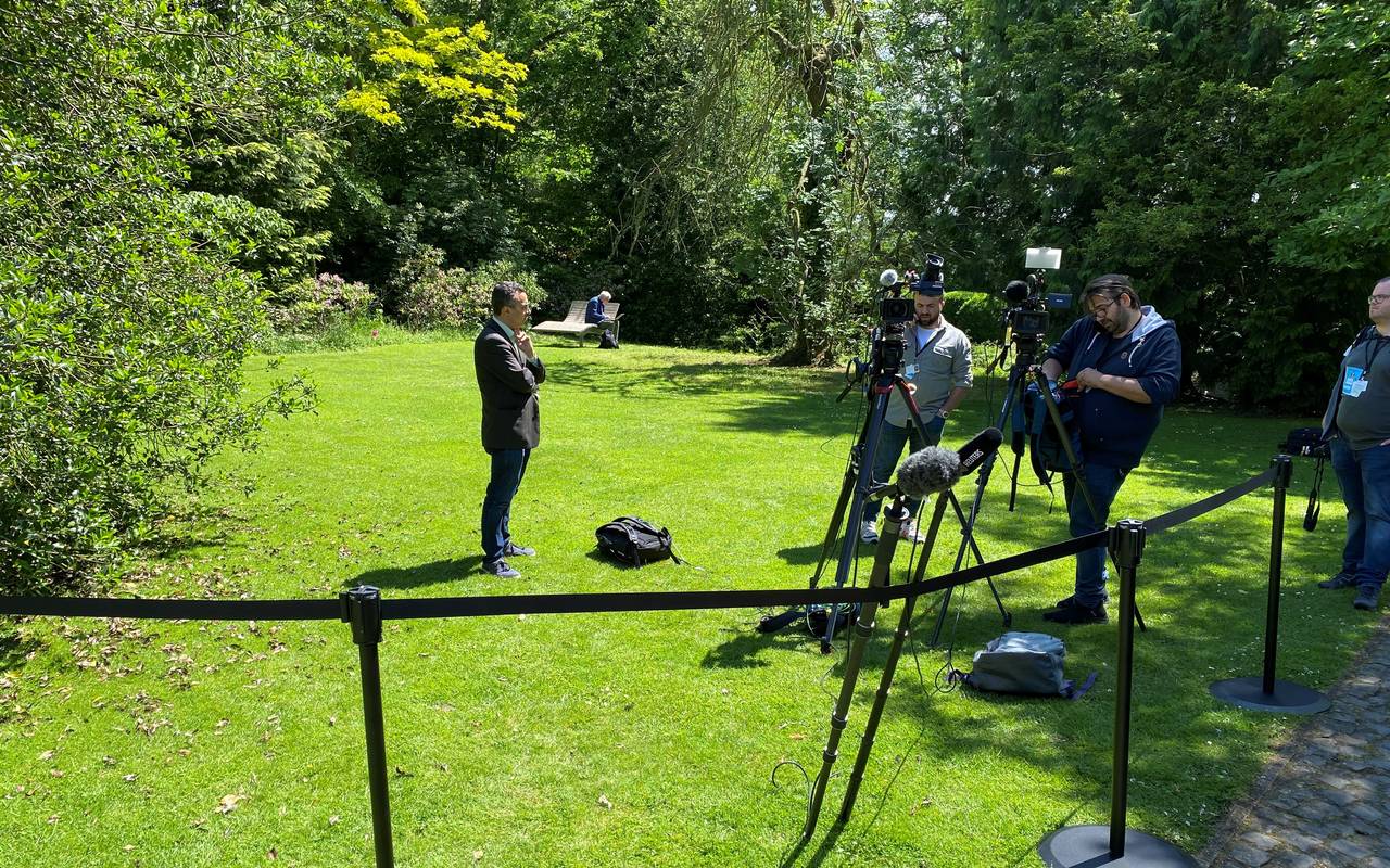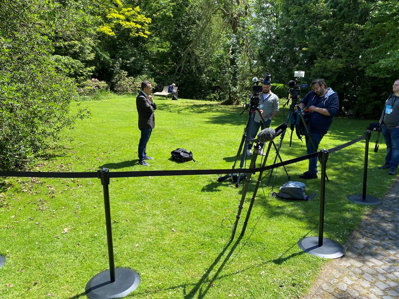 Auch eine Preisverleihung macht hungrig. Mit einiger Verspätung sind Präsident Macron und Bundespräsident Steinmeier im Schloss Wilkinghege eingetroffen. Dort gab es ein gemeinsames Essen. Danach kommen Abschluss-Statements. Zuvor mussten aber noch eilig schwarze Trennbänder am Hotel aufgestellt werden. Diese sogenannten Tensatoren hat dann David Schnitker von der Firma debug flugs geliefert und platziert. Ohne die Bänder gebe es keine Statements.